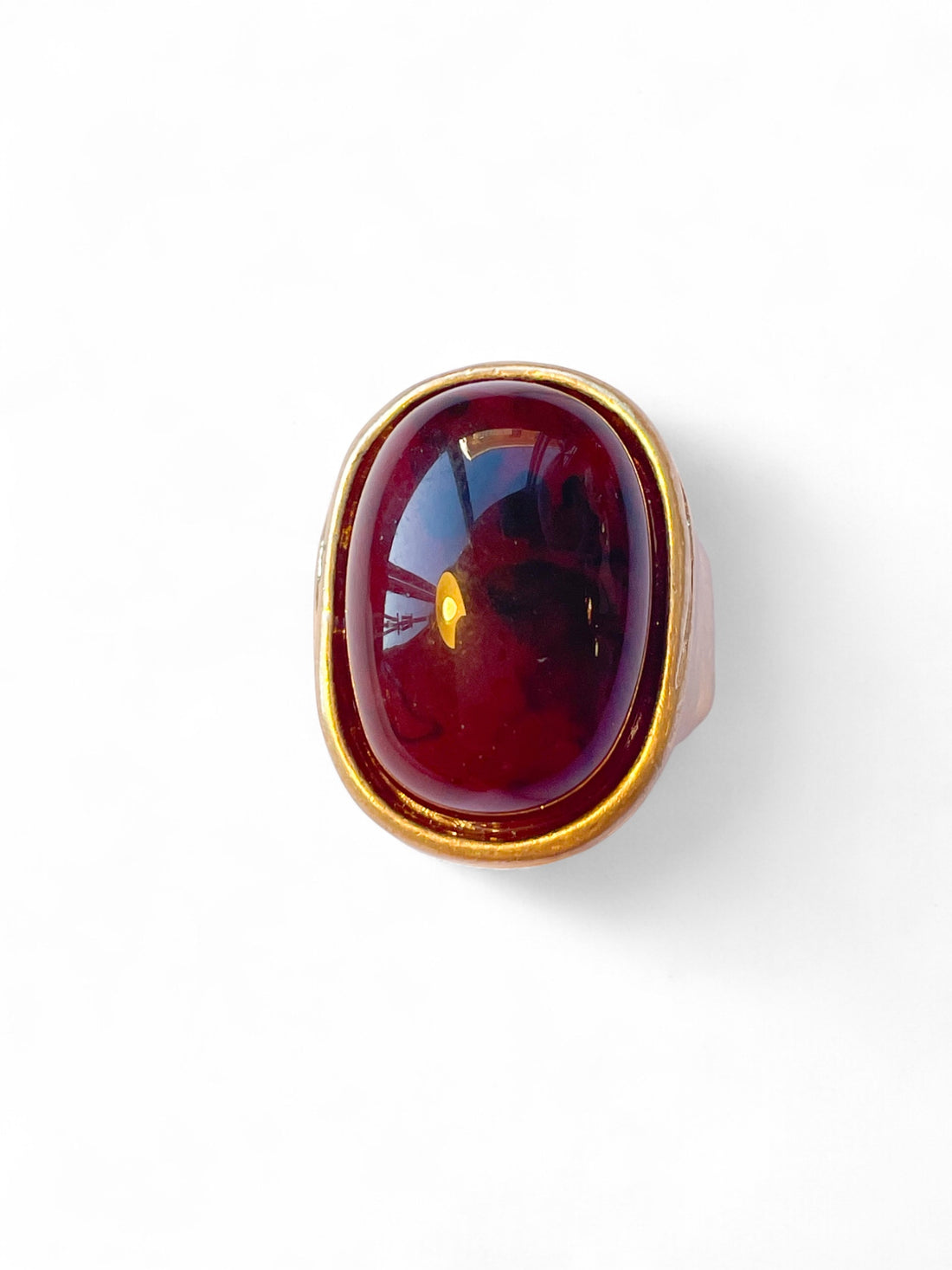 Bague statement au charme vintage, ornée d’un cabochon ovale en résine bordeaux profonde, encadré d’un...