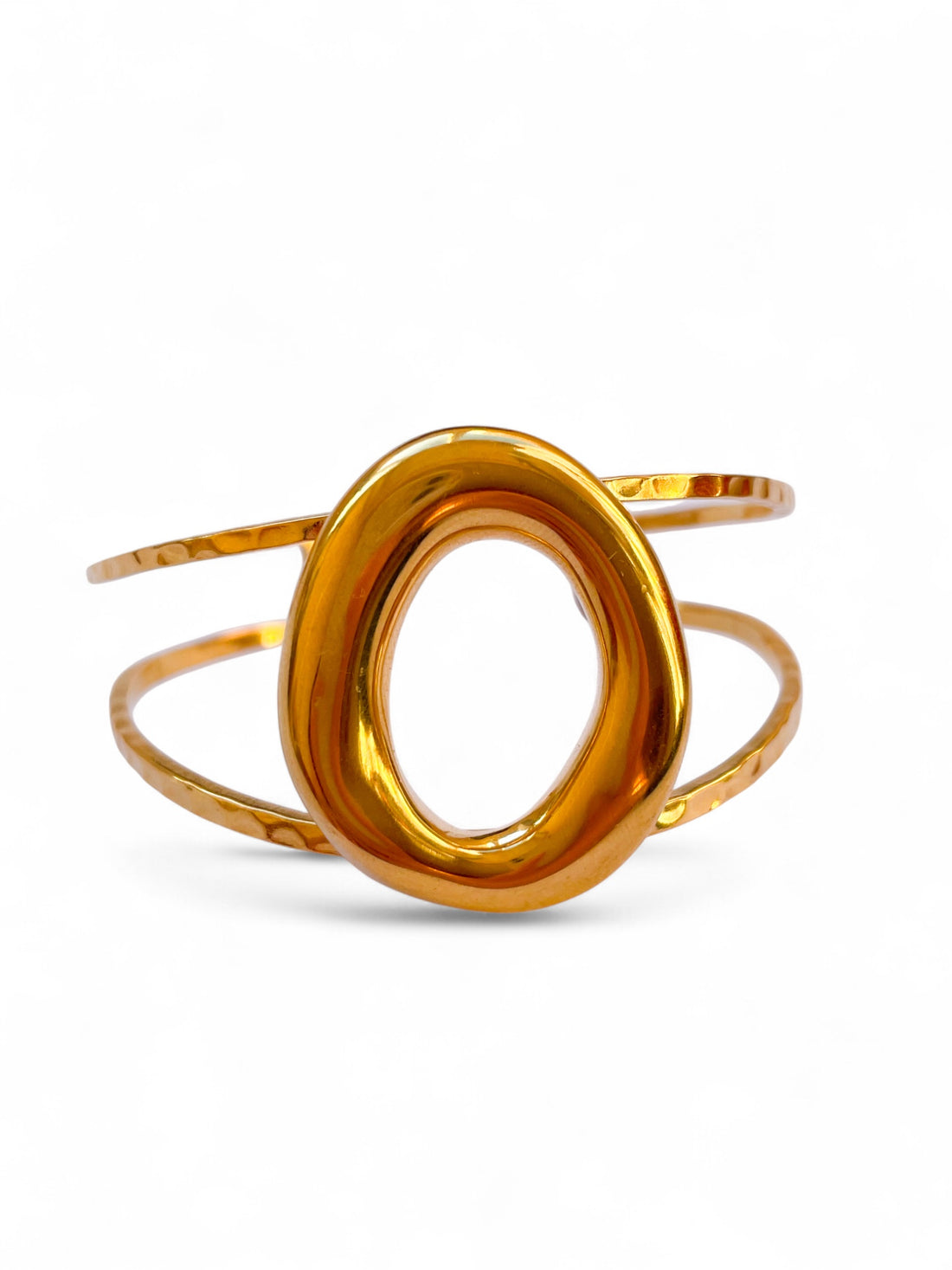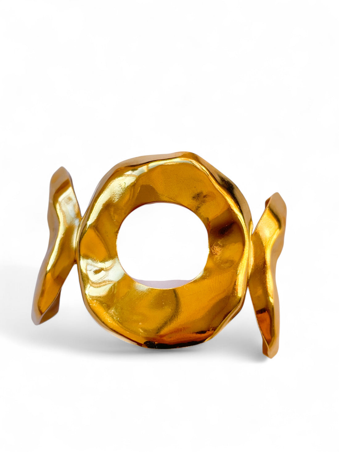 Bracelet doré à la silhouette ronde et sculpturale, au design irrégulier qui capte la lumière...