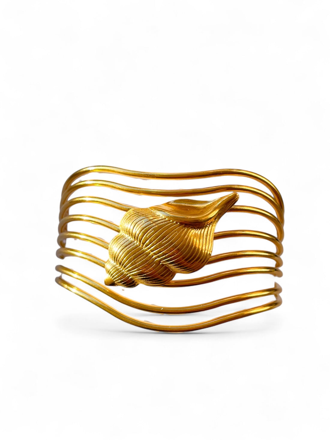 Bracelet doré au design sculptural inspiré des formes en spirale des fossiles d’ammonite. Acier inoxydable...
