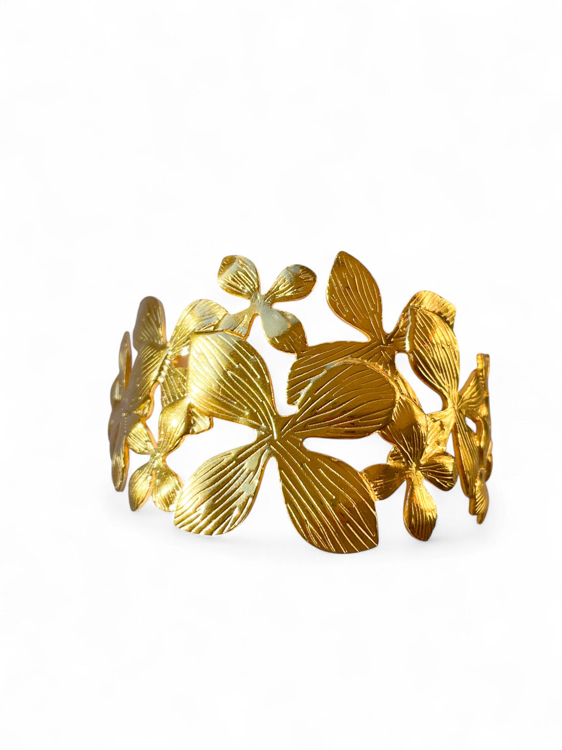 Jonc doré ajouré formé de fleurs délicates aux pétales texturés, inspiré d’un jardin sauvage en...