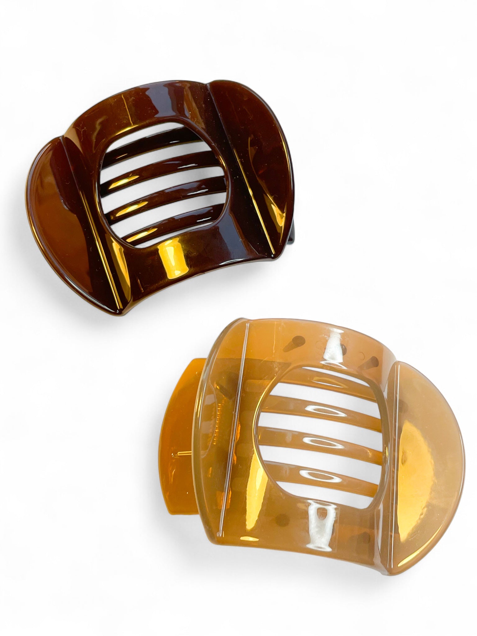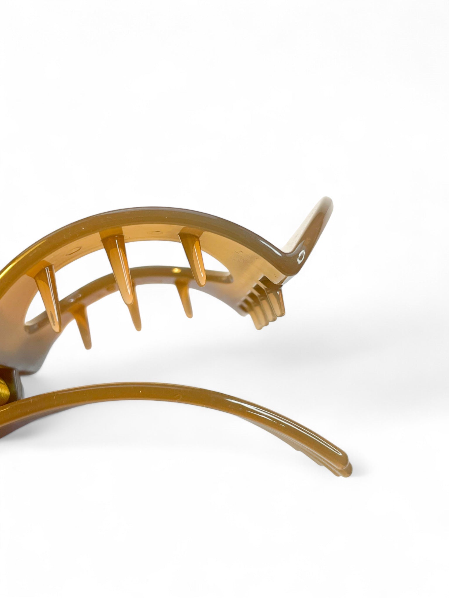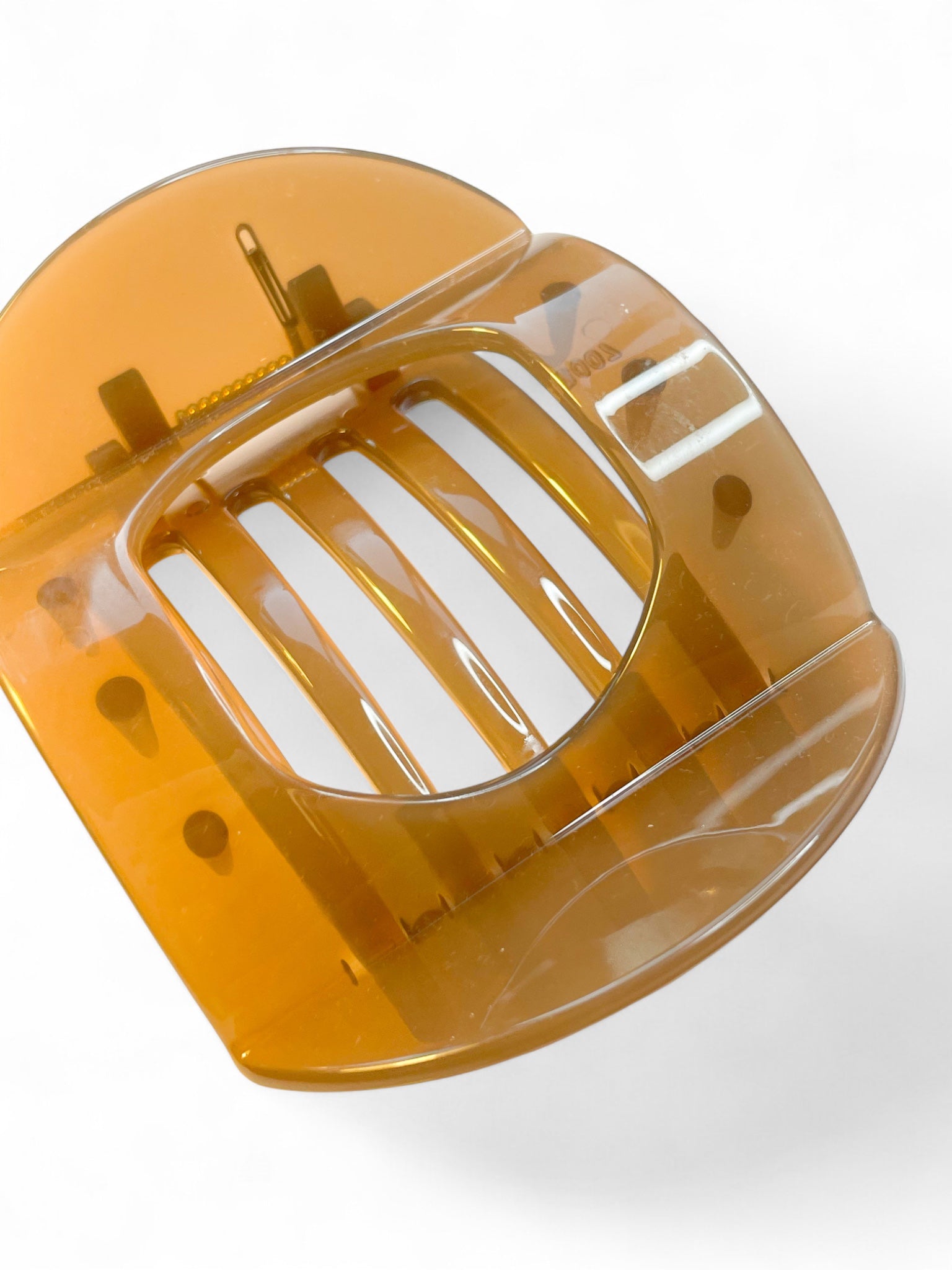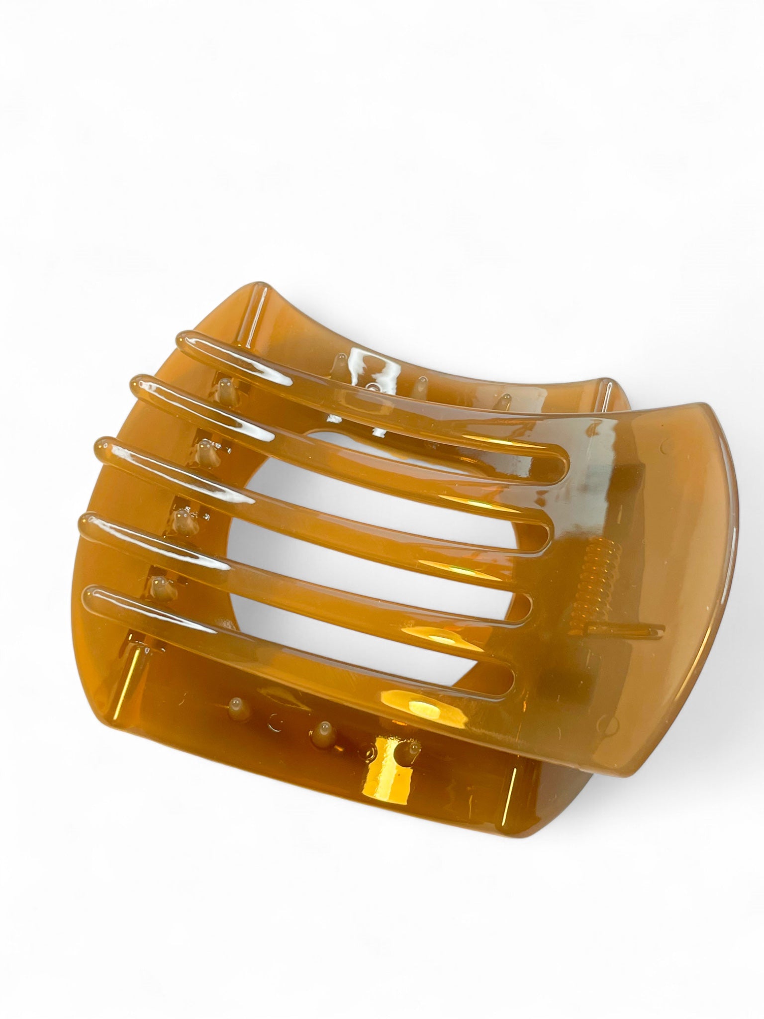 Barrette sculpturale en résine translucide aux reflets ambrés profonds, au design ovale moderne et raffiné.