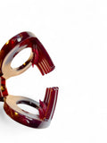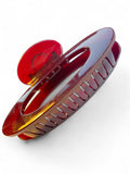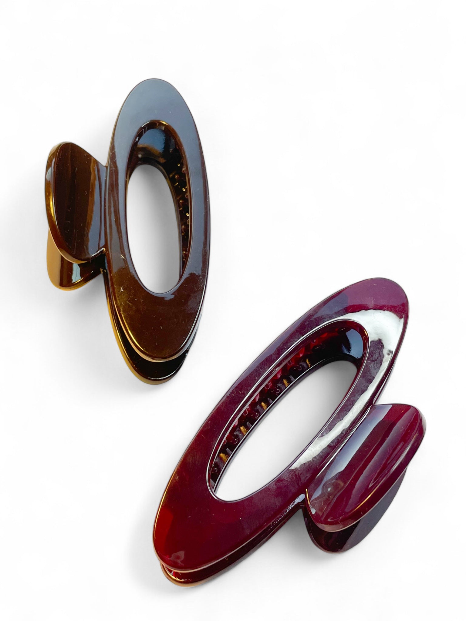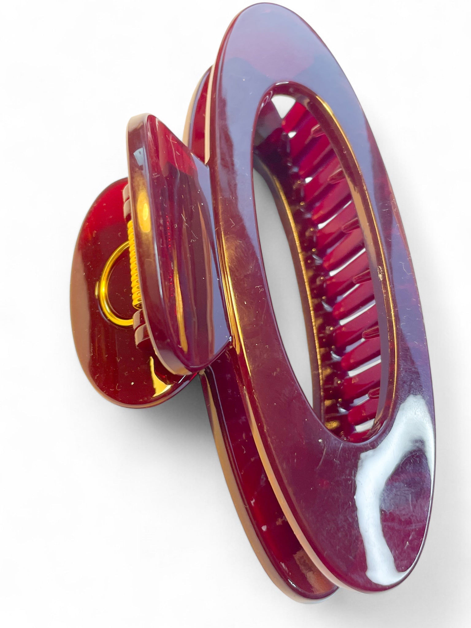 Barrette sculpturale en résine translucide aux reflets ambrés profonds, au design ovale moderne et raffiné.
