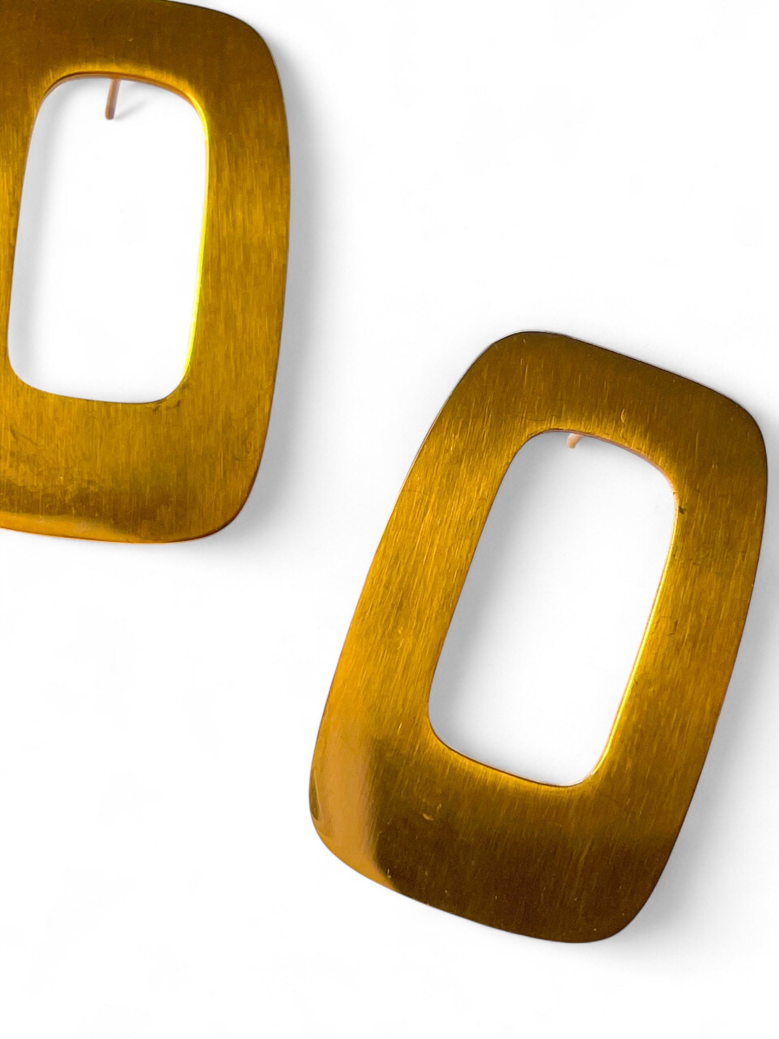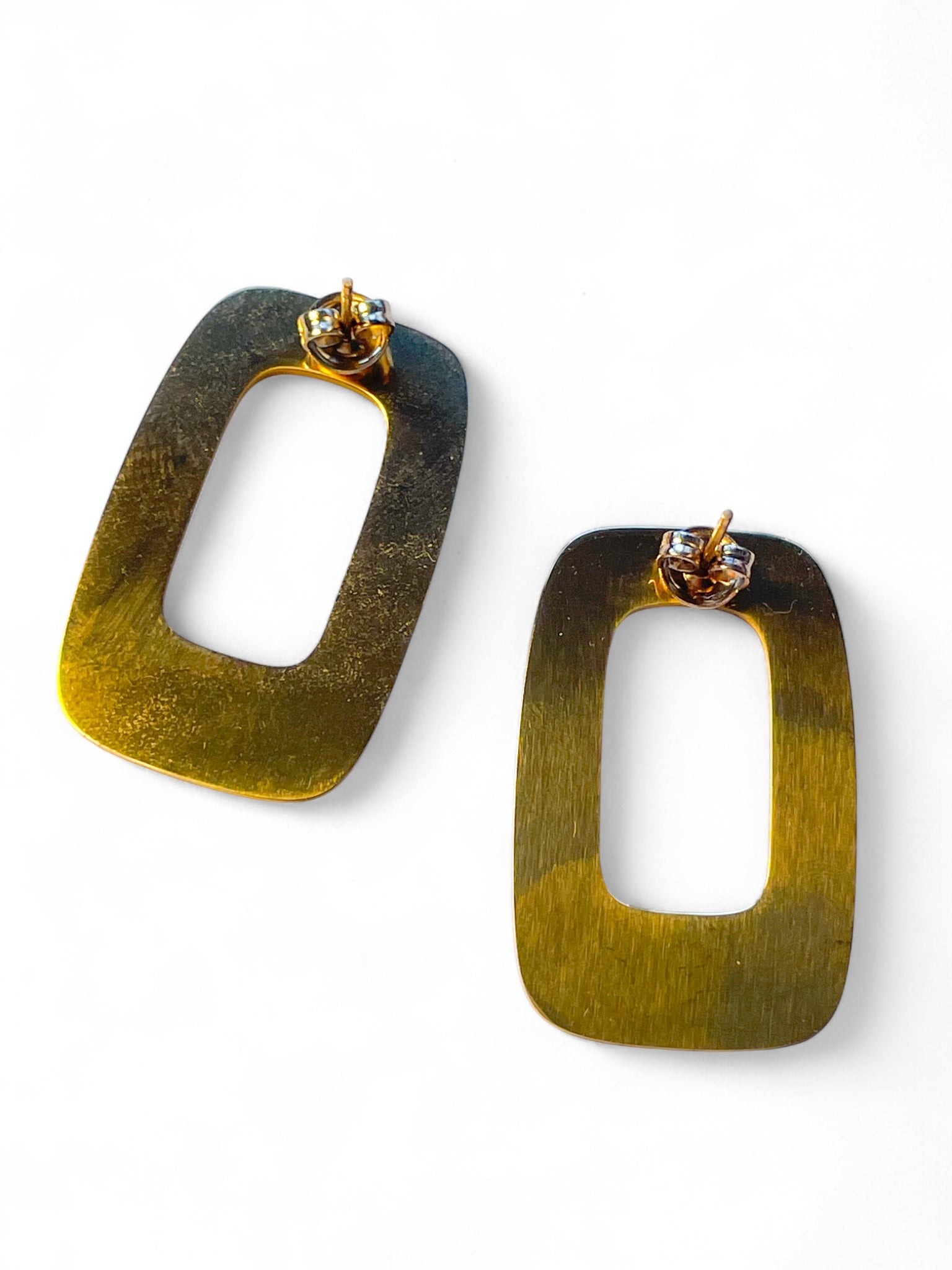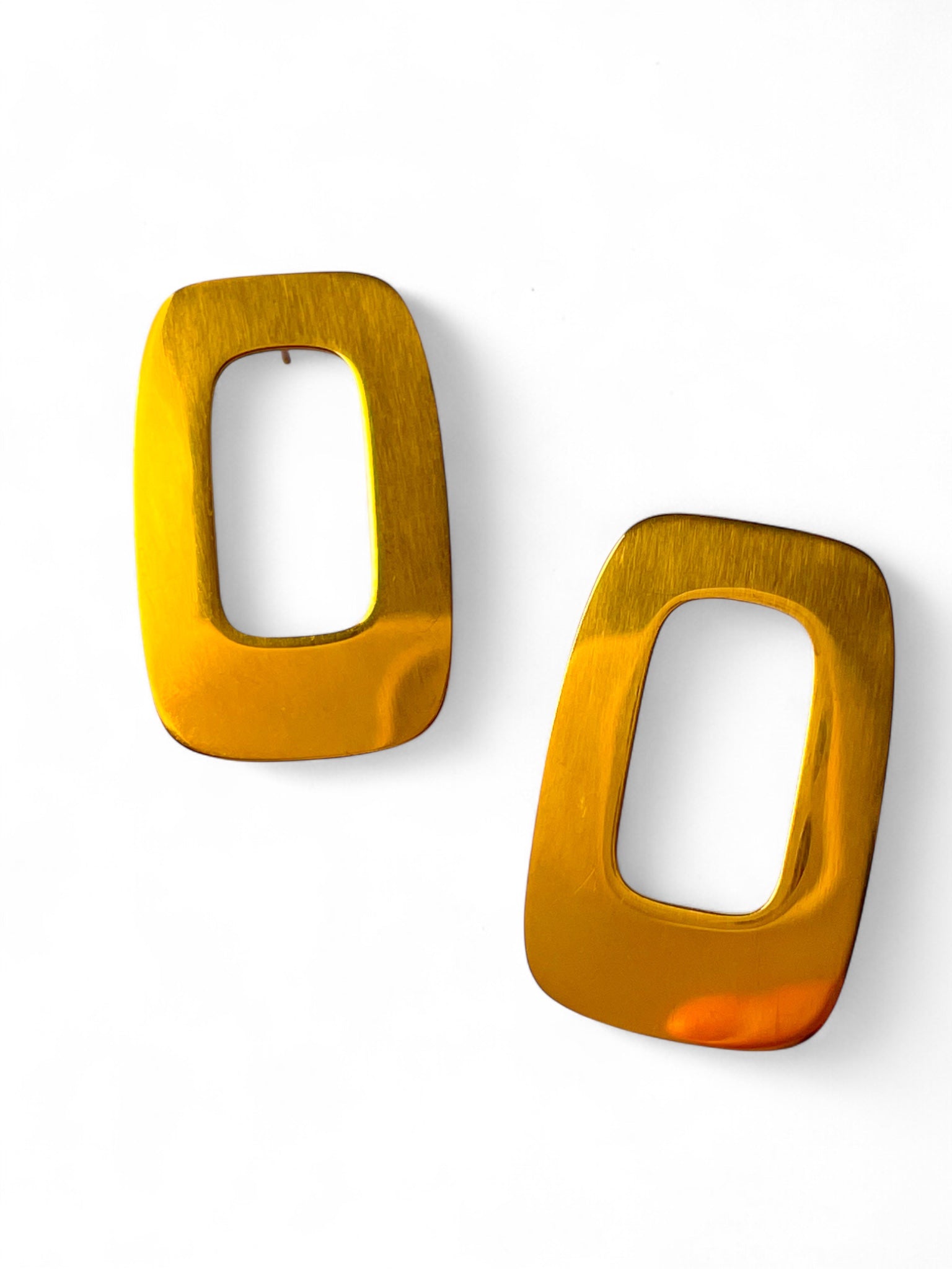 - Boucles d’oreilles géométriques au design minimaliste et audacieux, formées de rectangles ajourés en métal doré lisse.
