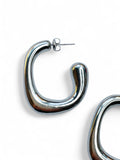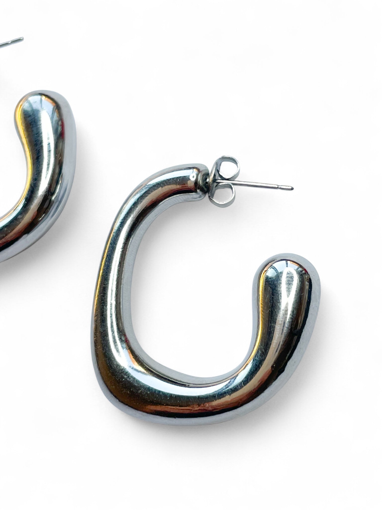 Boucles d’oreilles minimalistes au design moderne, à la forme organique légèrement carrée, en métal argenté poli effet miroir.