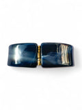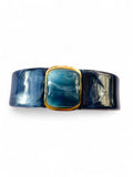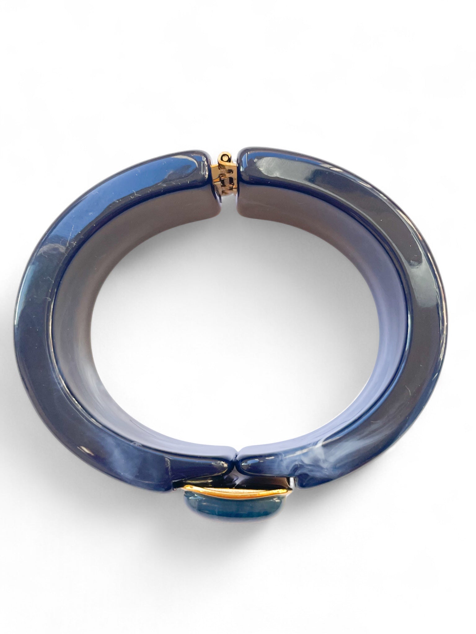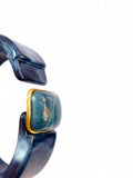 - Bracelet rigide en résine bleu marbré avec un grand médaillon carré encadré d’un contour doré, au style chic et sophistiqué.