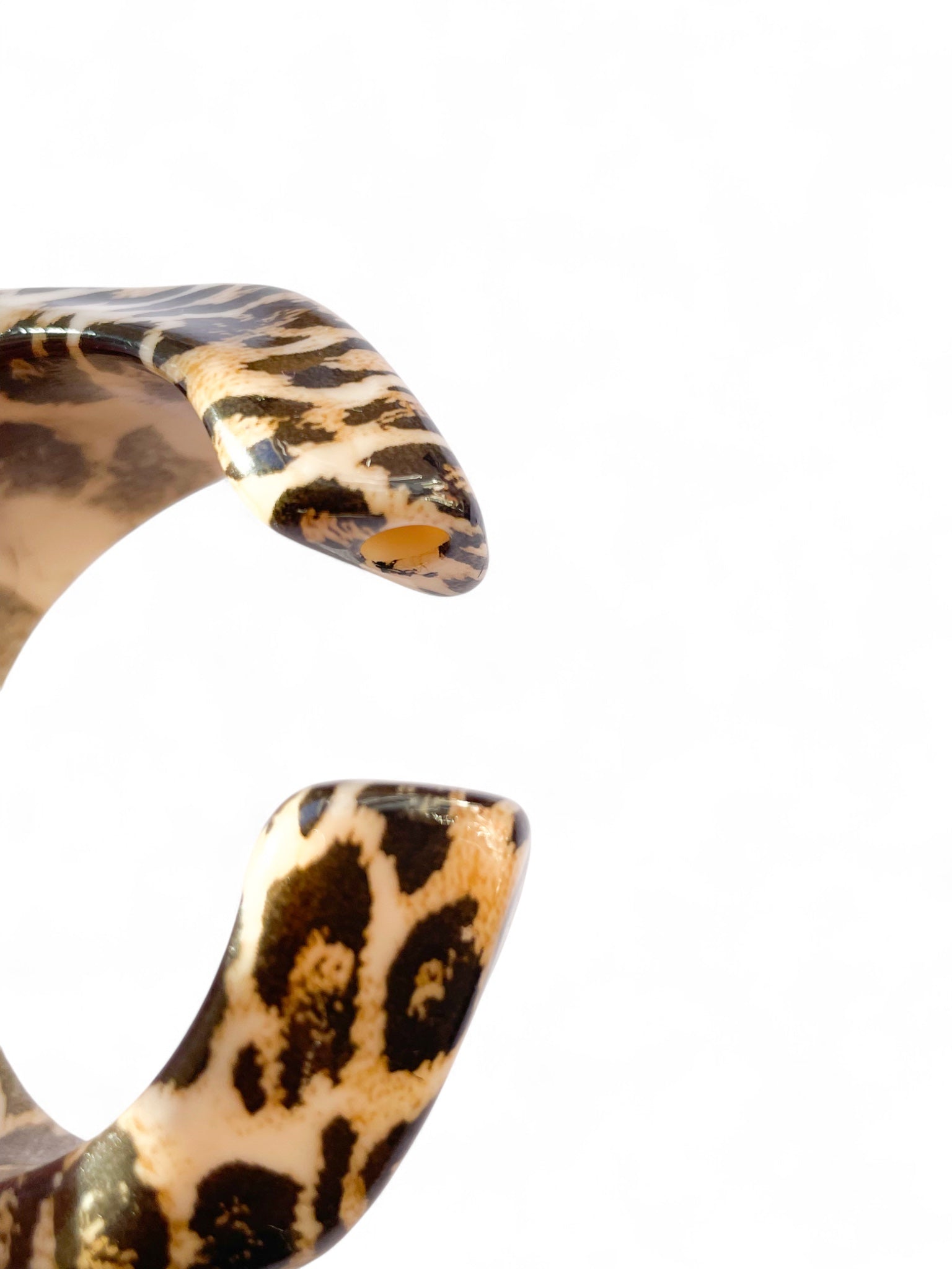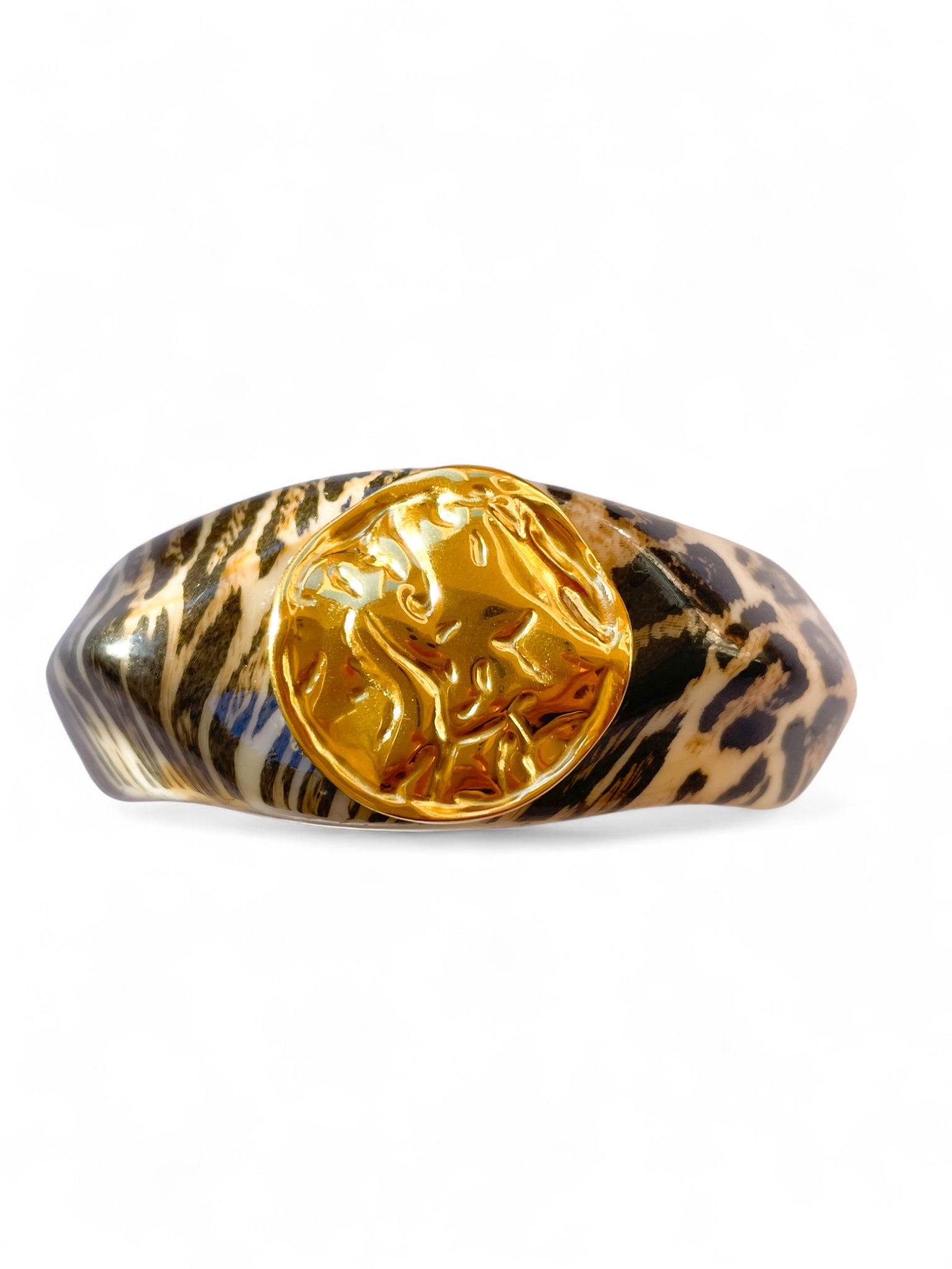 - Bracelet rigide en résine imprimé léopard orné d’un médaillon doré texturé au centre, au design élégant et artistique.
