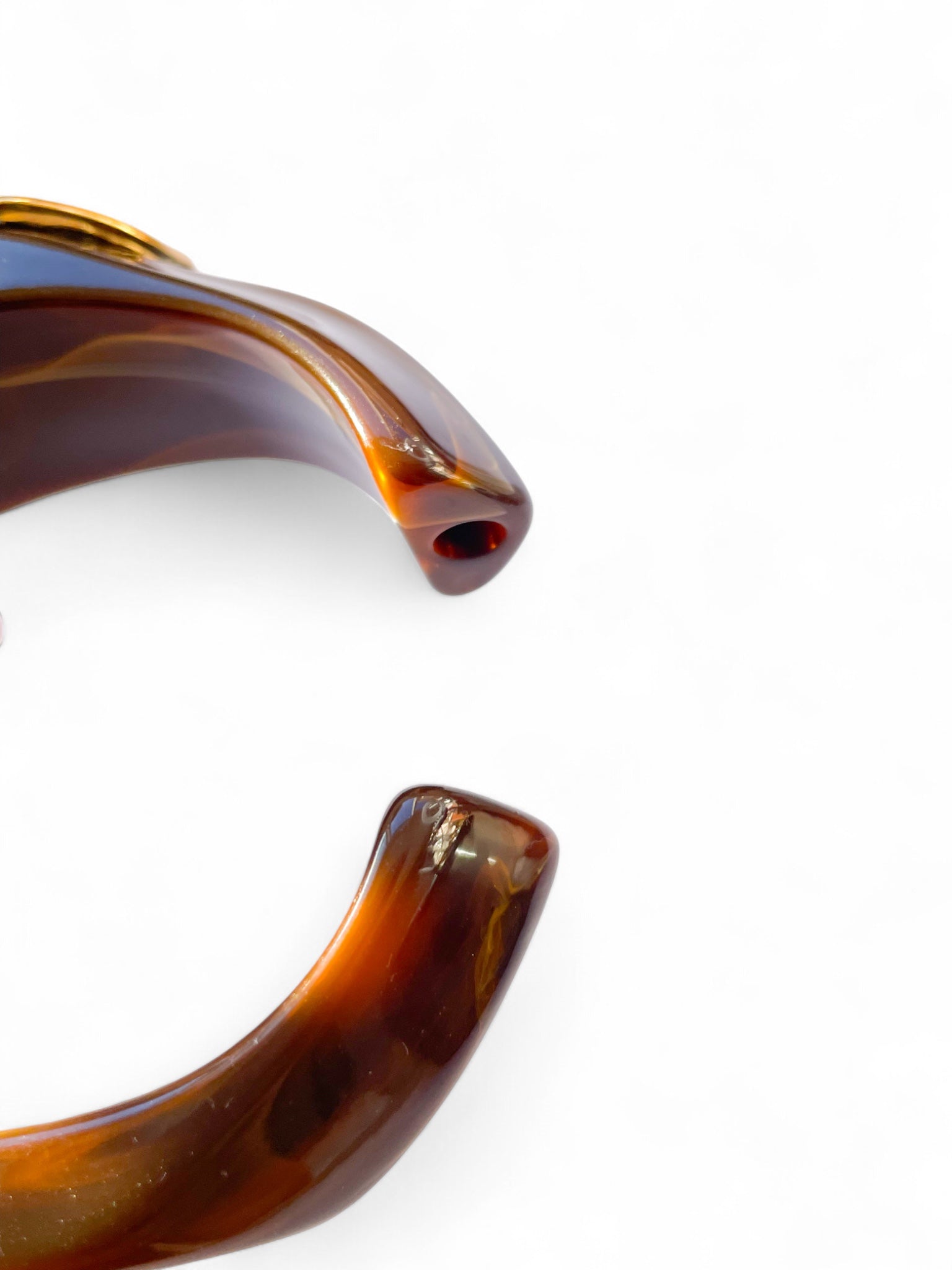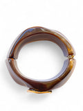 - Bracelet rigide en résine marron orné d’un médaillon doré texturé au centre, au design élégant et artistique.