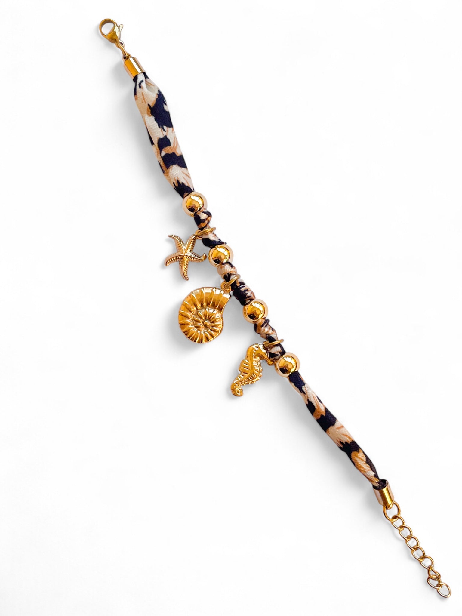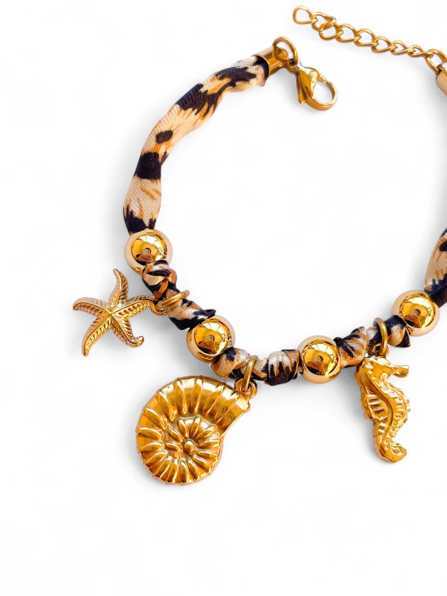 Bracelet ajustable au ruban à imprimé léopard, orné de perles dorées et de pendentifs marins raffinés : une étoile de mer, un coquillage en spirale et un hippocampe délicat.