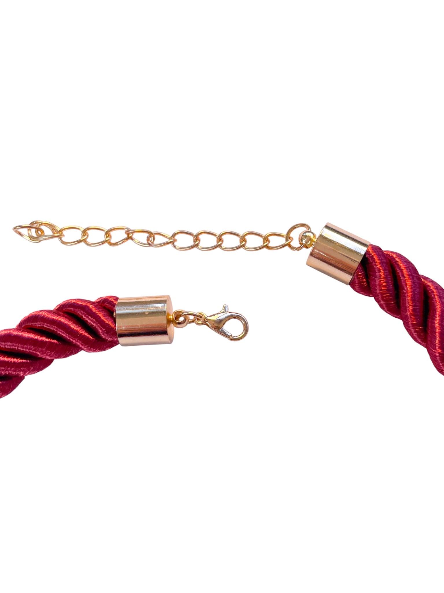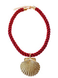 - Collier élégant et audacieux composé d’un cordon torsadé rouge profond et d’un pendentif coquille Saint-Jacques dorée, pour un style marin chic et sophistiqué.