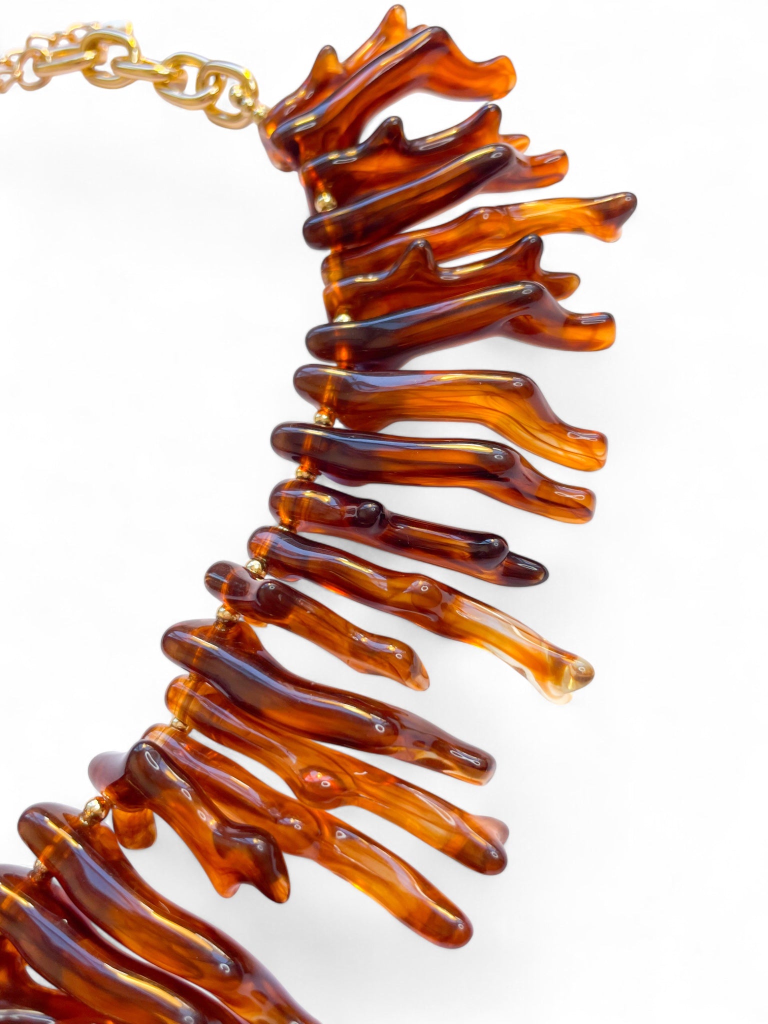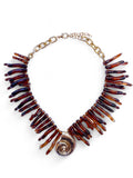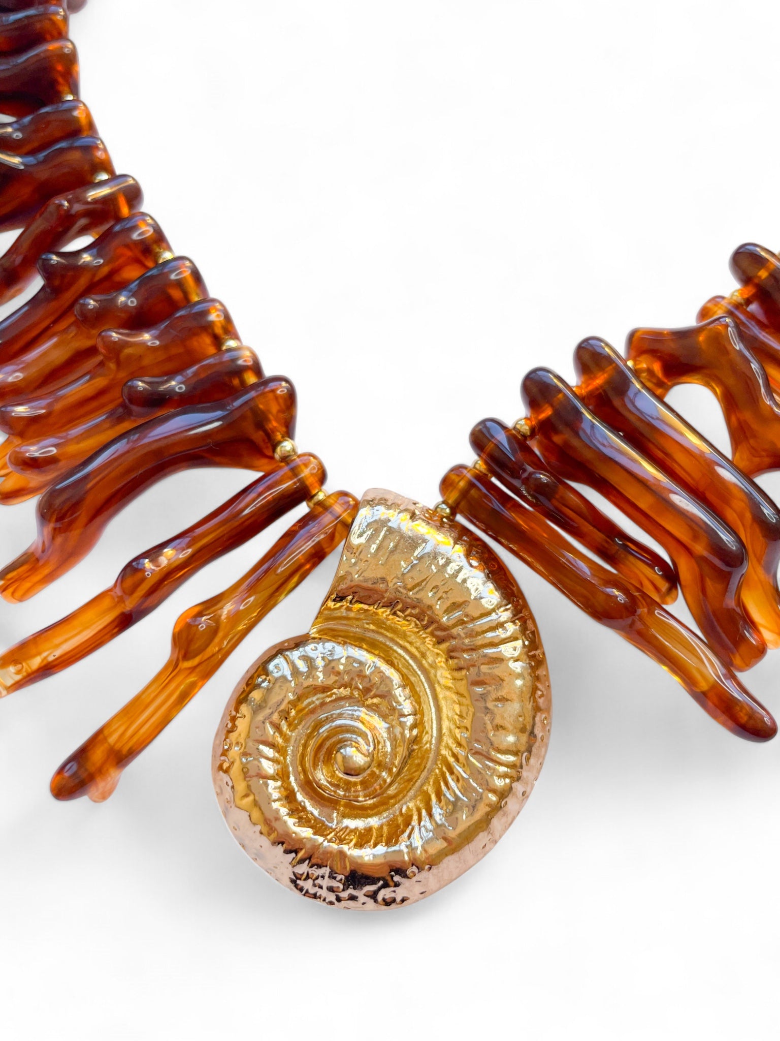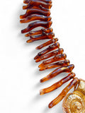 - Collier statement au style marin et audacieux, composé de branches en résine ambrée et d’un grand pendentif coquillage doré au centre.