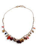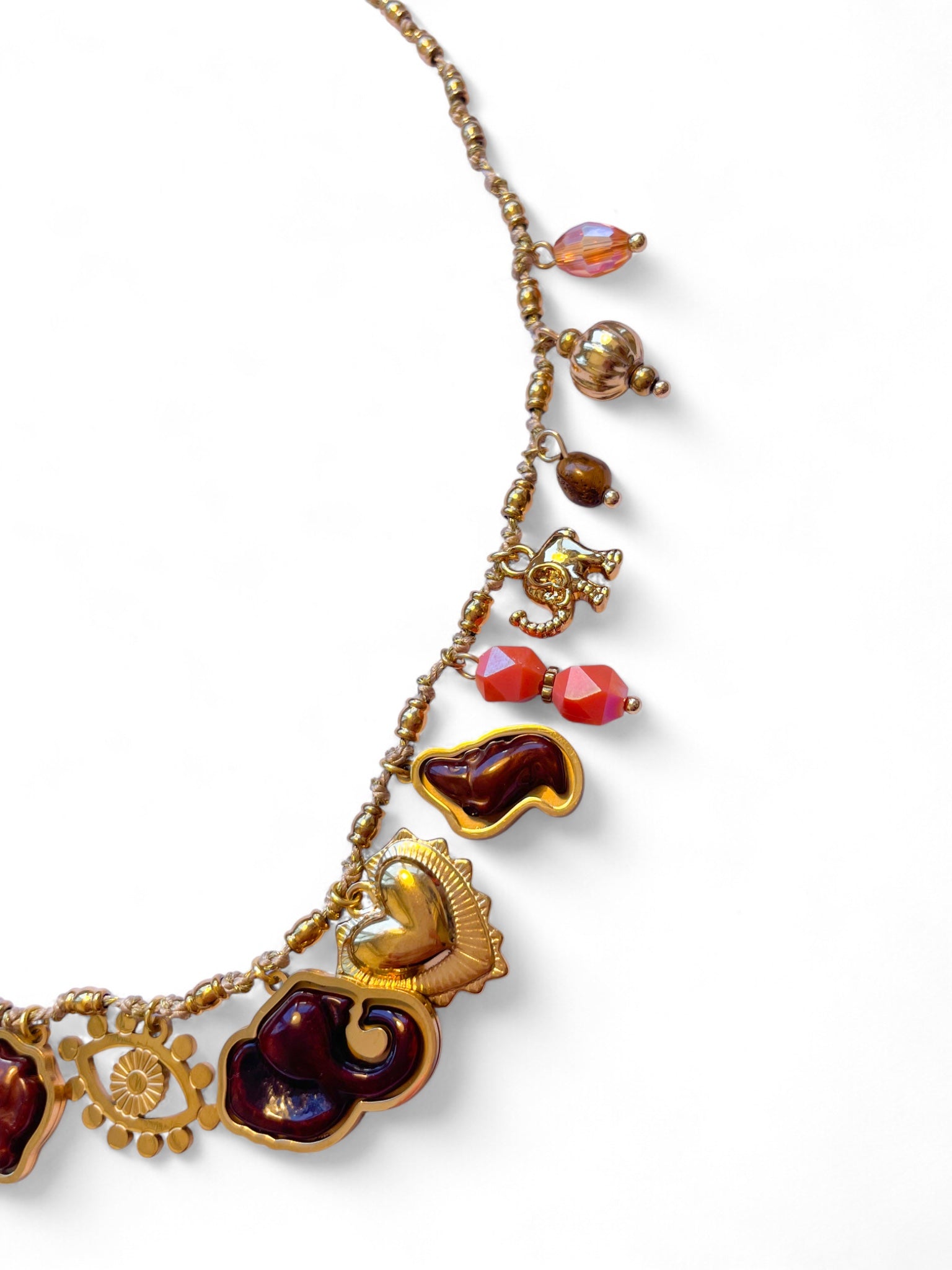 - Collier fin et élégant au charme bohème, composé de petites perles dorées et de pampilles variées : pierres ambrées, symboles porte-bonheur, animaux et médaillons dorés.