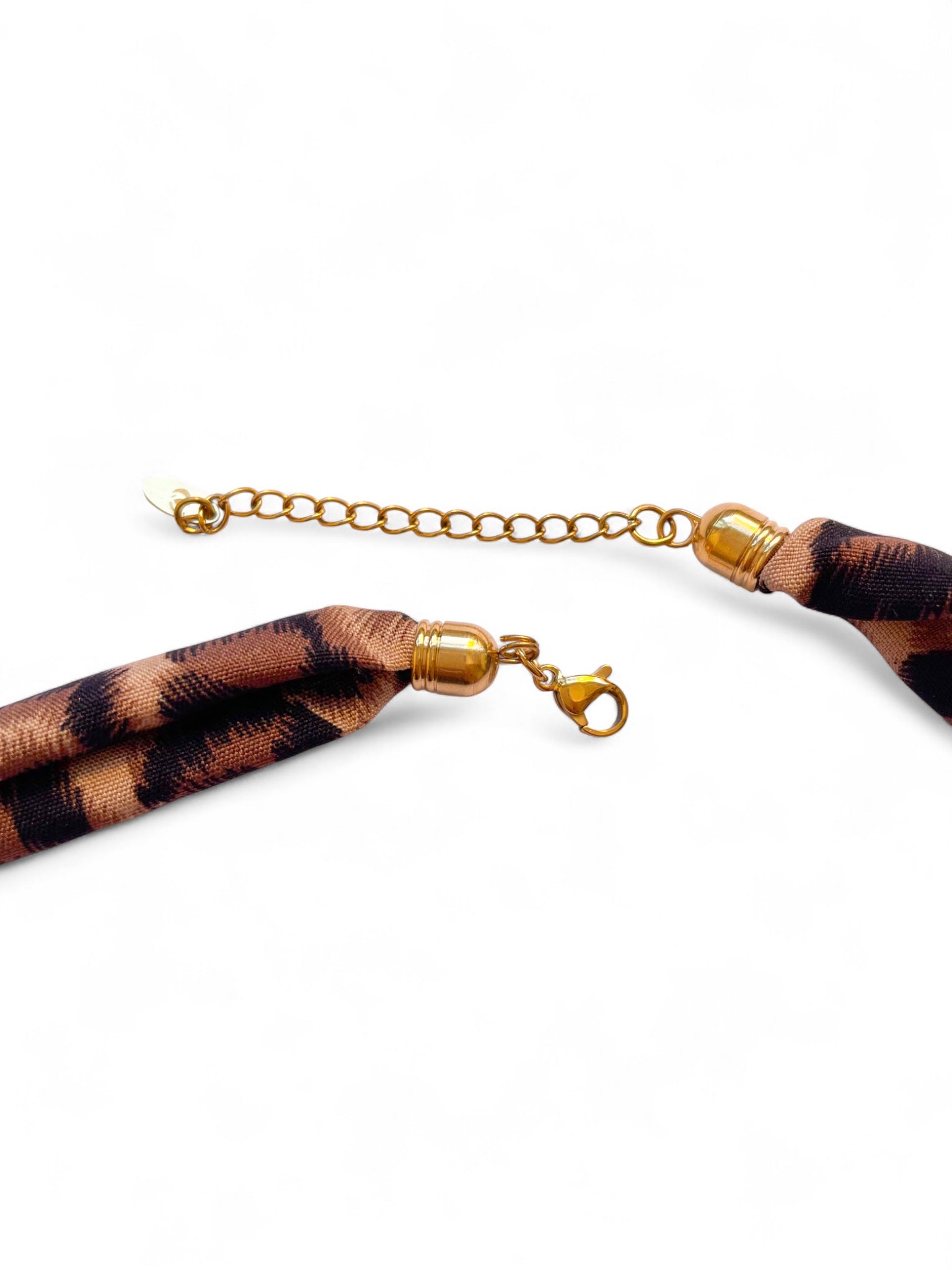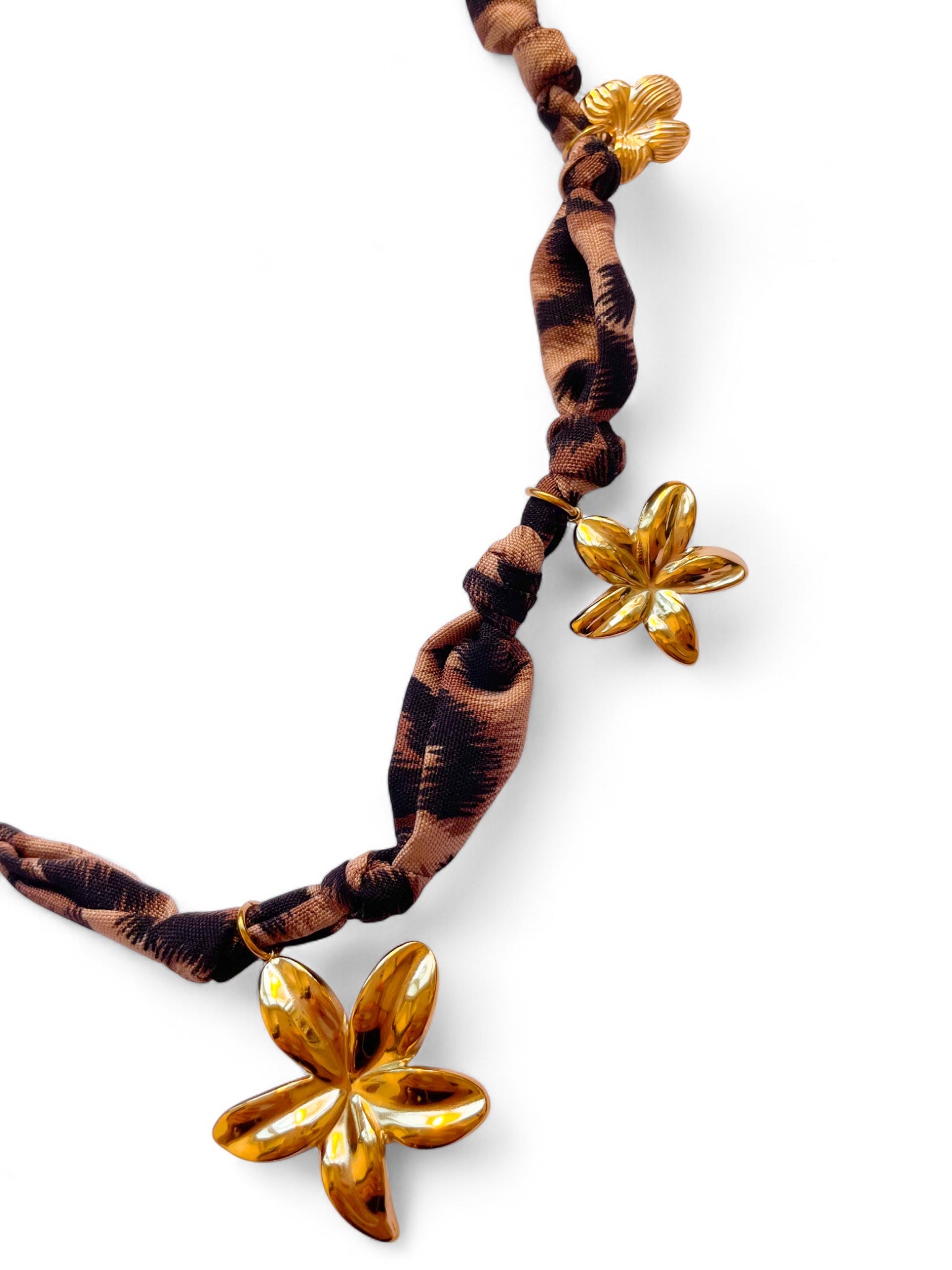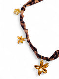 Collier bohème chic composé d’un ruban imprimé animalier et orné de fleurs dorées lumineuses, pour un style féminin et sauvage à la fois.