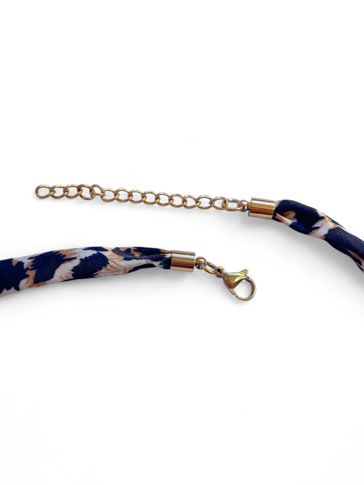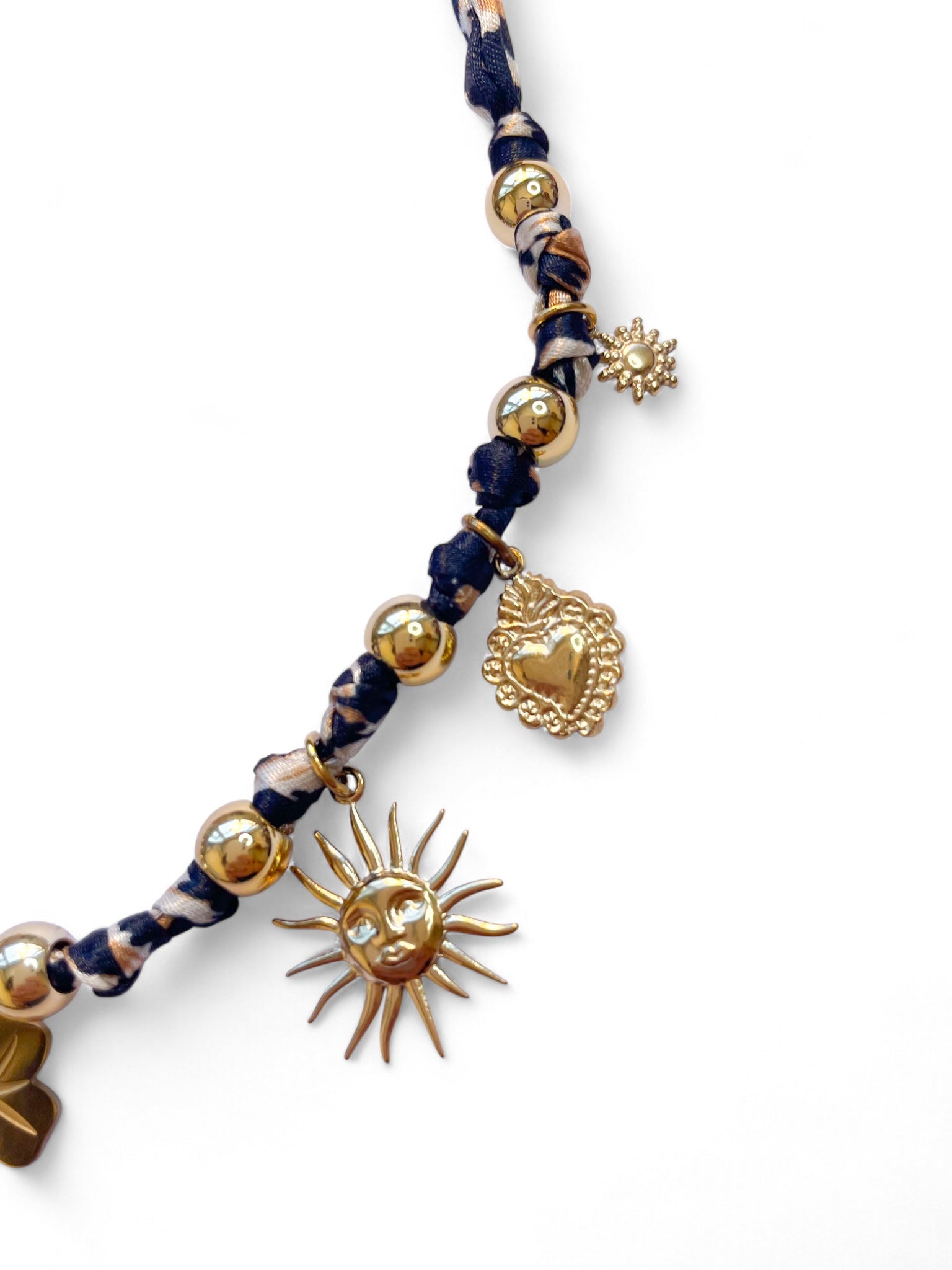 - Collier bohème chic orné de charms dorés symboliques — trèfle, soleil, cœur sacré, rose et coquillages — montés sur un ruban imprimé bleu marine élégant.
