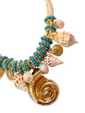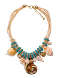 - Collier bohème marin orné de coquillages naturels, de perles turquoise et d’un grand pendentif coquille dorée, pour un esprit chic et estival.