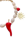 - Collier audacieux et ensoleillé orné de grosses perles ivoire, d’un pendentif piment rouge vif, de petites cerises émaillées et de charms dorés solaires et végétaux.