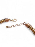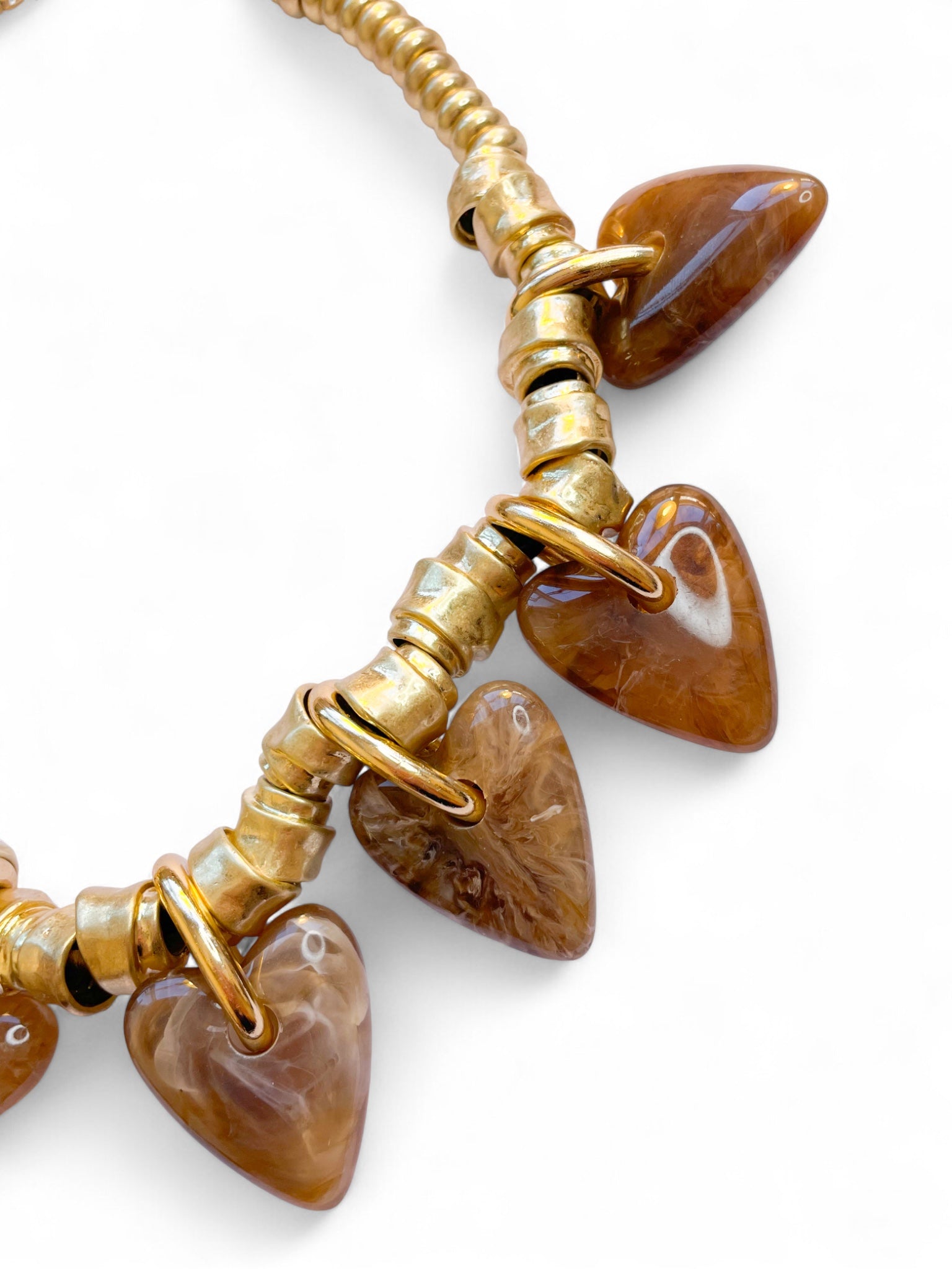 - Collier audacieux et chaleureux composé de perles dorées mates à l’effet vintage et de pendentifs cœurs en résine brune marbrée, pour un style bohème chic et intemporel.