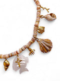 - Collier bohème marin composé de perles naturelles aux tons sable, orné de charms dorés — coquillages, poissons, tortue et étoiles — pour un style chic et ensoleillé.