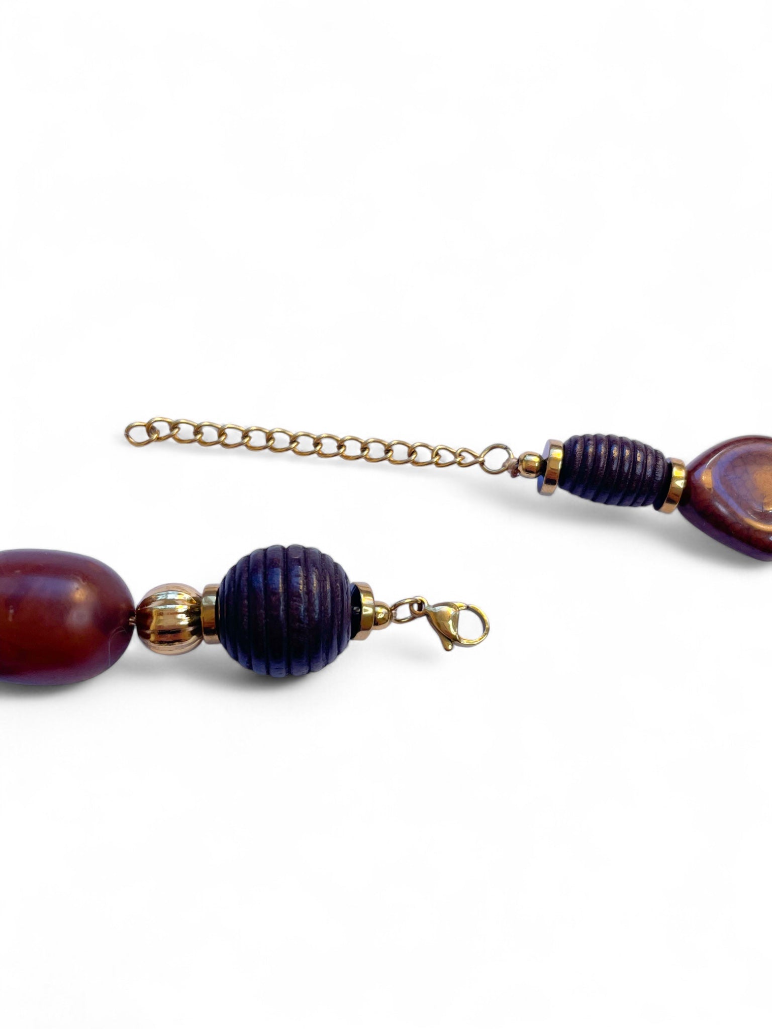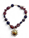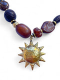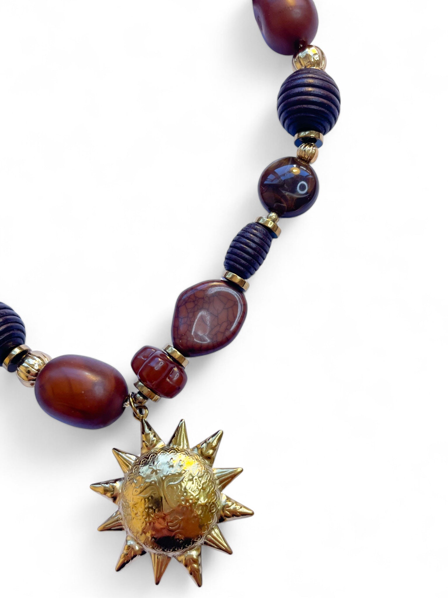 - Collier bohème et puissant composé de perles en bois brun et bleu profond, rehaussé d’un grand pendentif soleil doré texturé au centre.