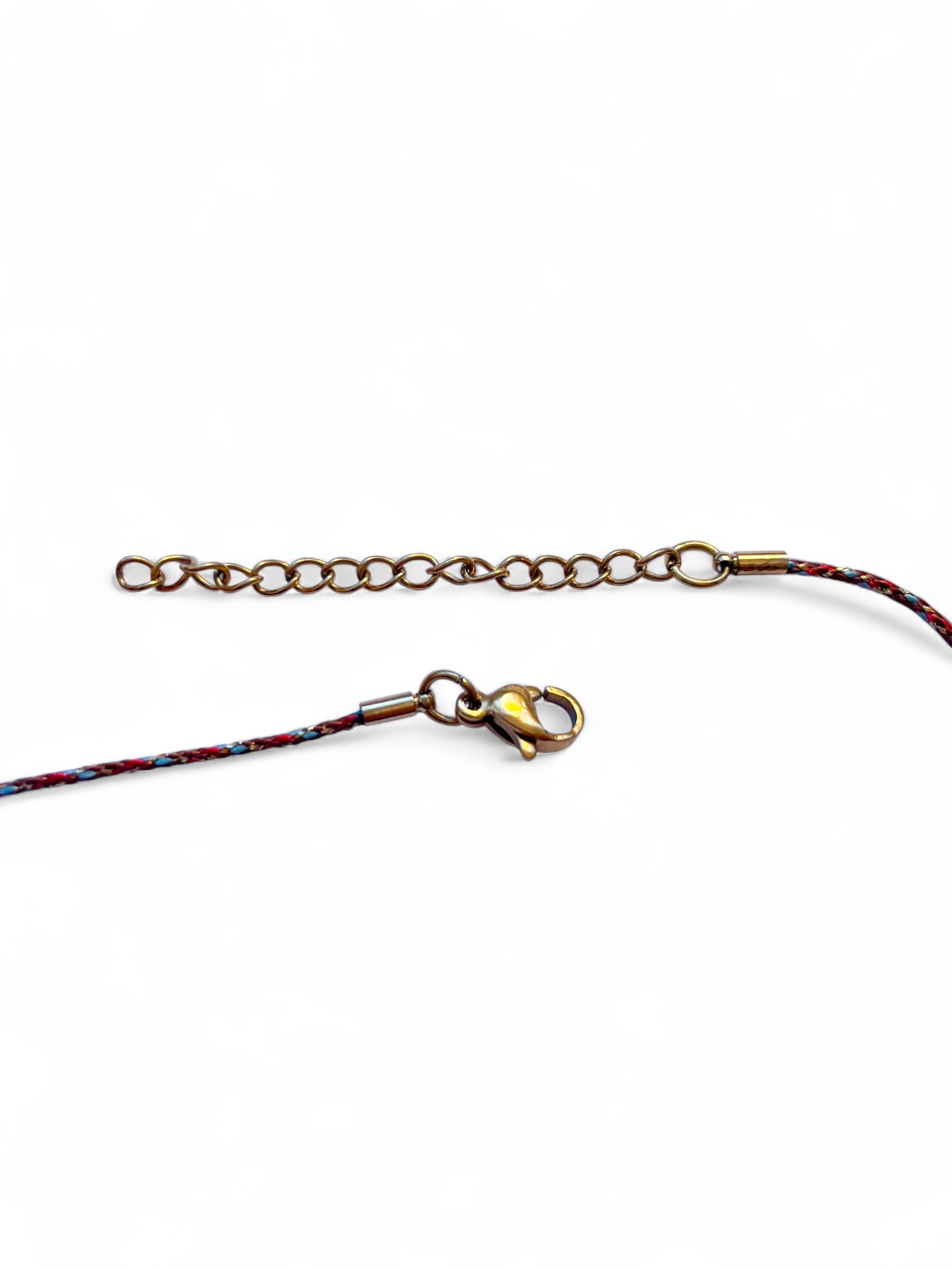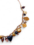 - Collier bohème chic composé d’un délicat cordon tressé orné de charms dorés, de cœurs aux nuances chaudes, de papillon, de pierres colorées et de perles lumineuses.
