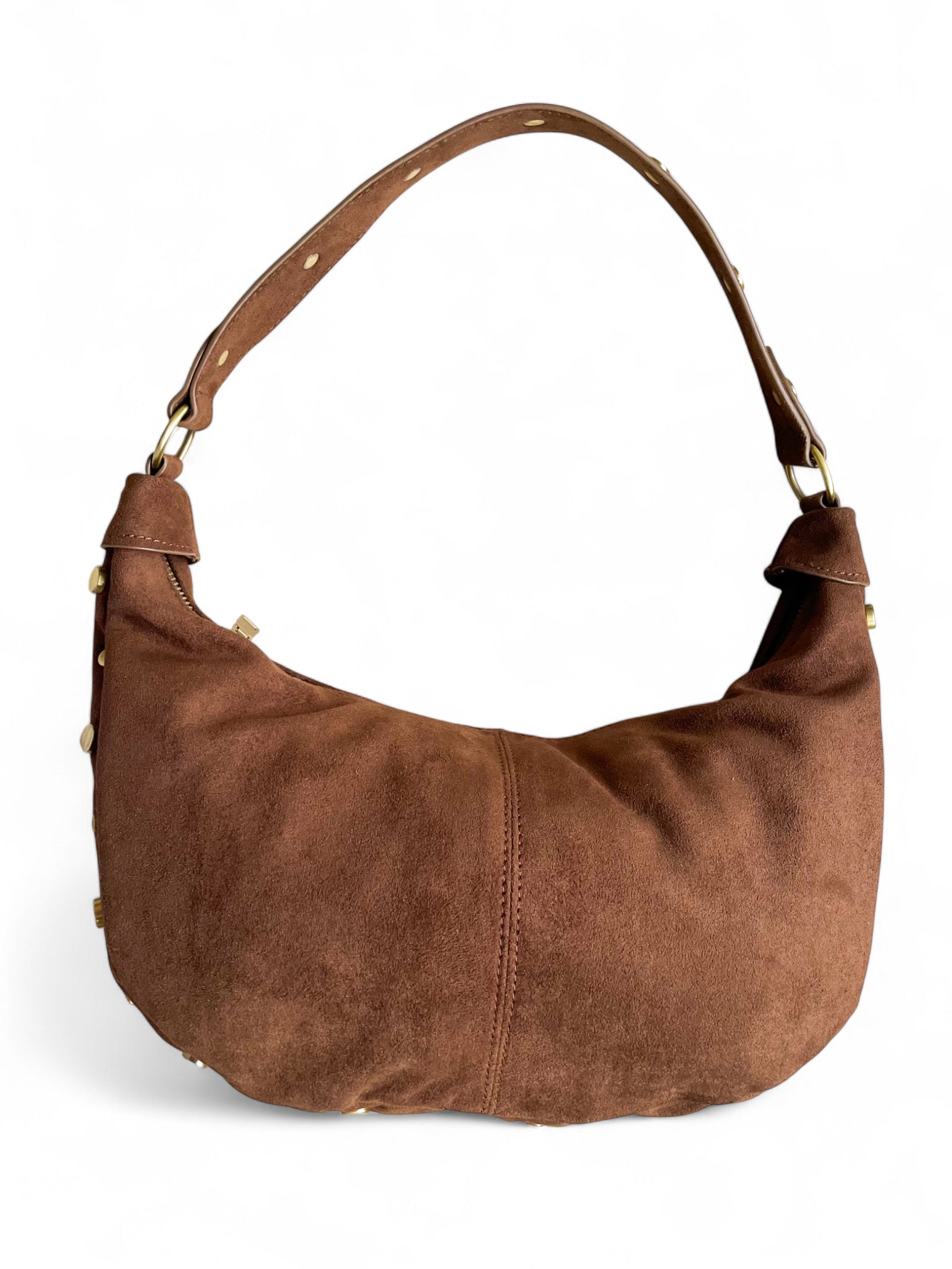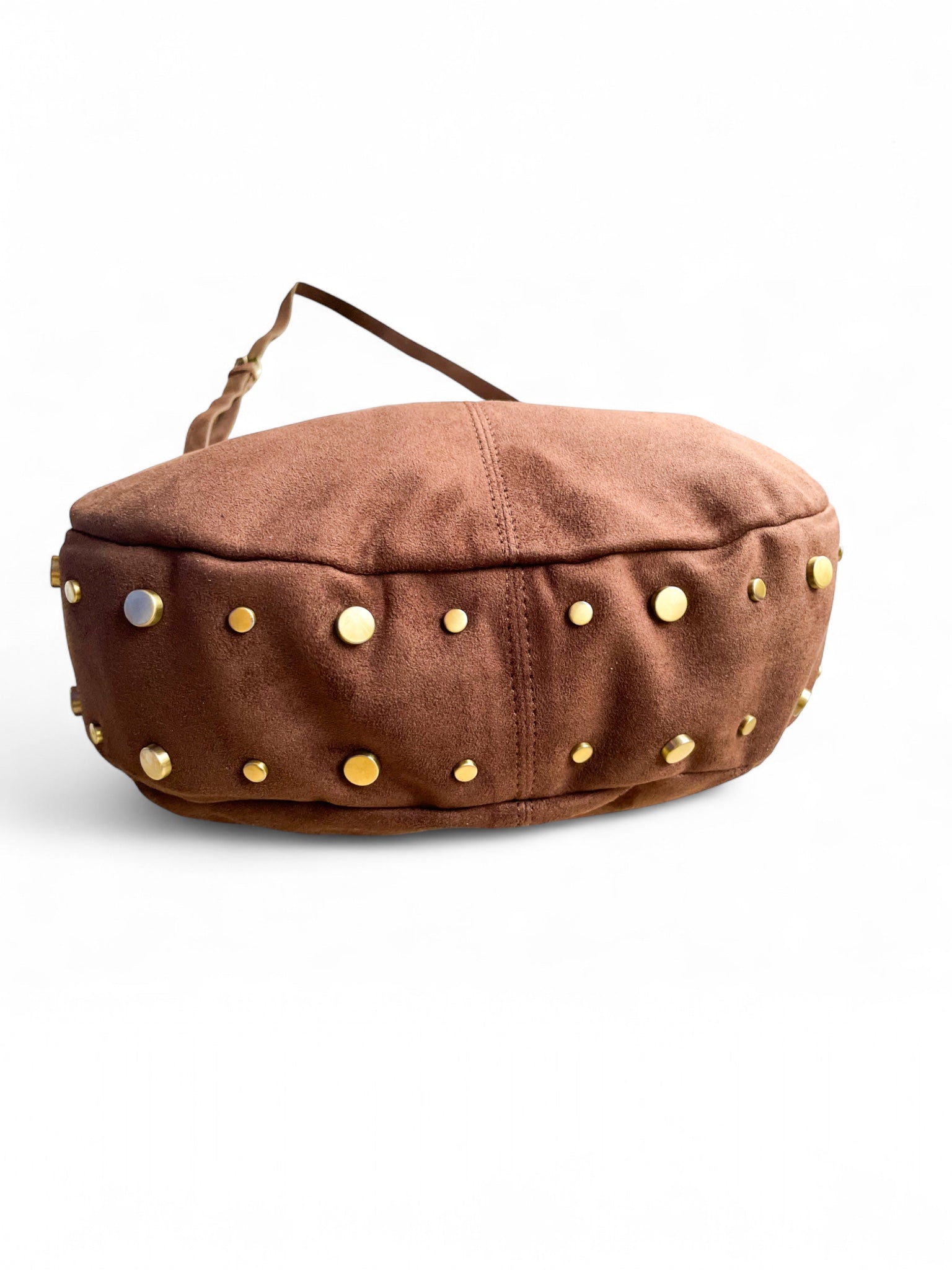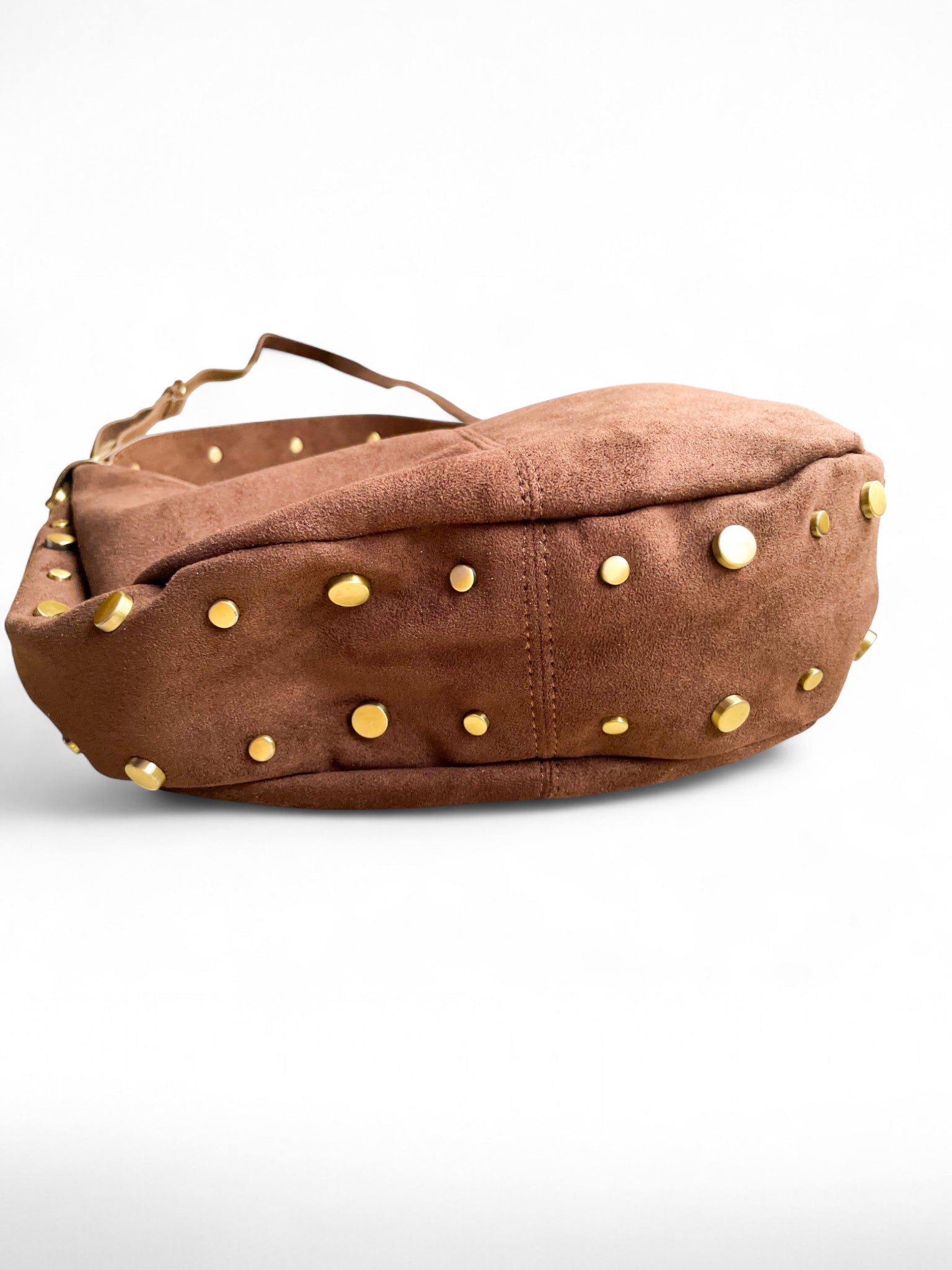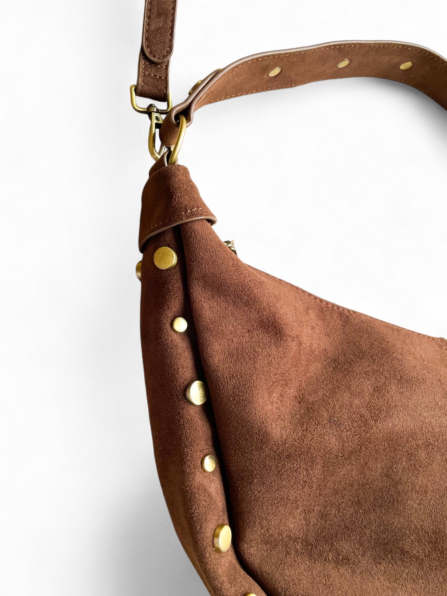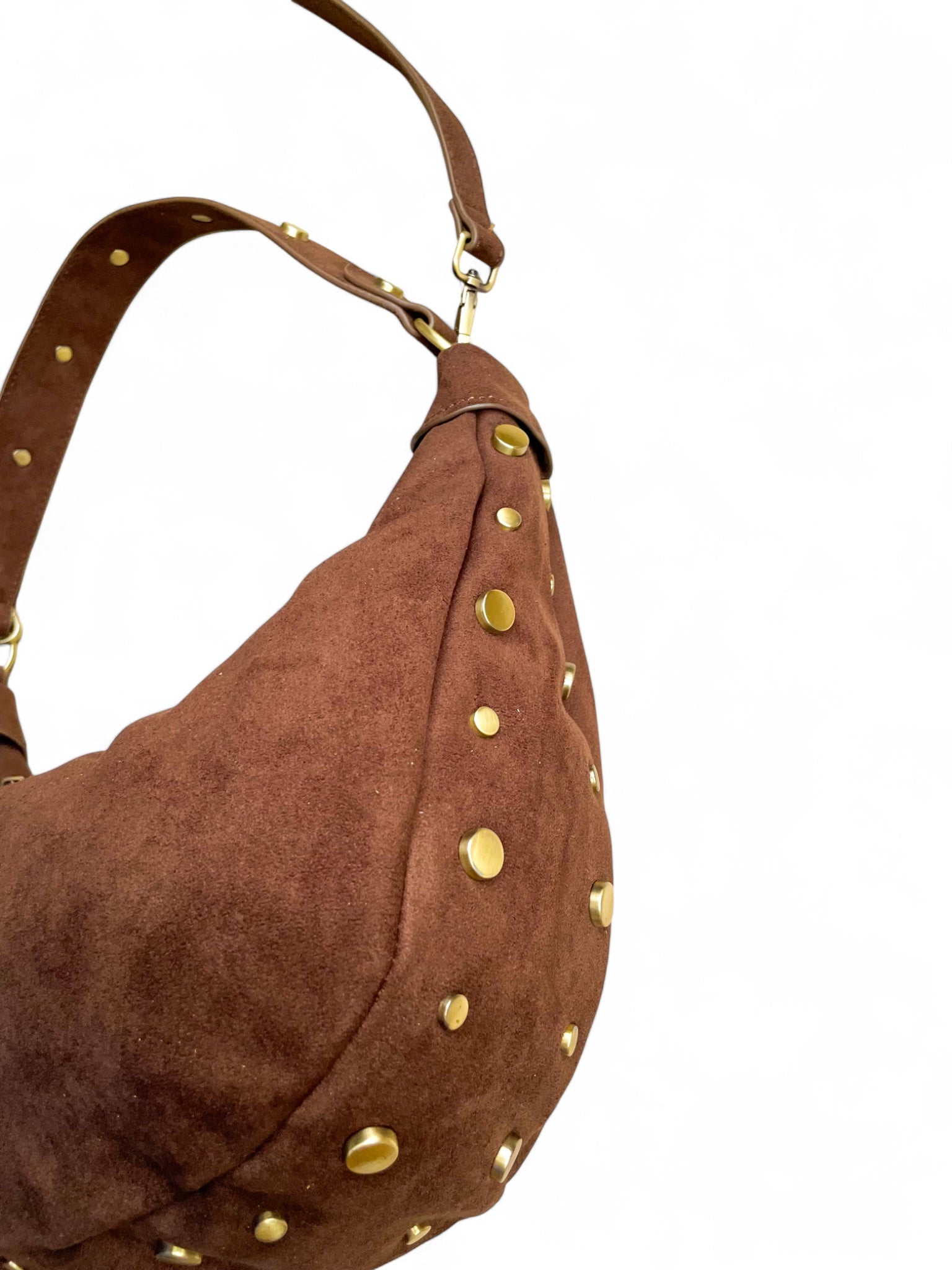 - Sac bandoulière Colette: un sac bandoulière en daim brun orné de rivets dorés sur les côtés et sur la petite bandoulière, au design arrondi et élégant pour un style bohème chic et intemporel.