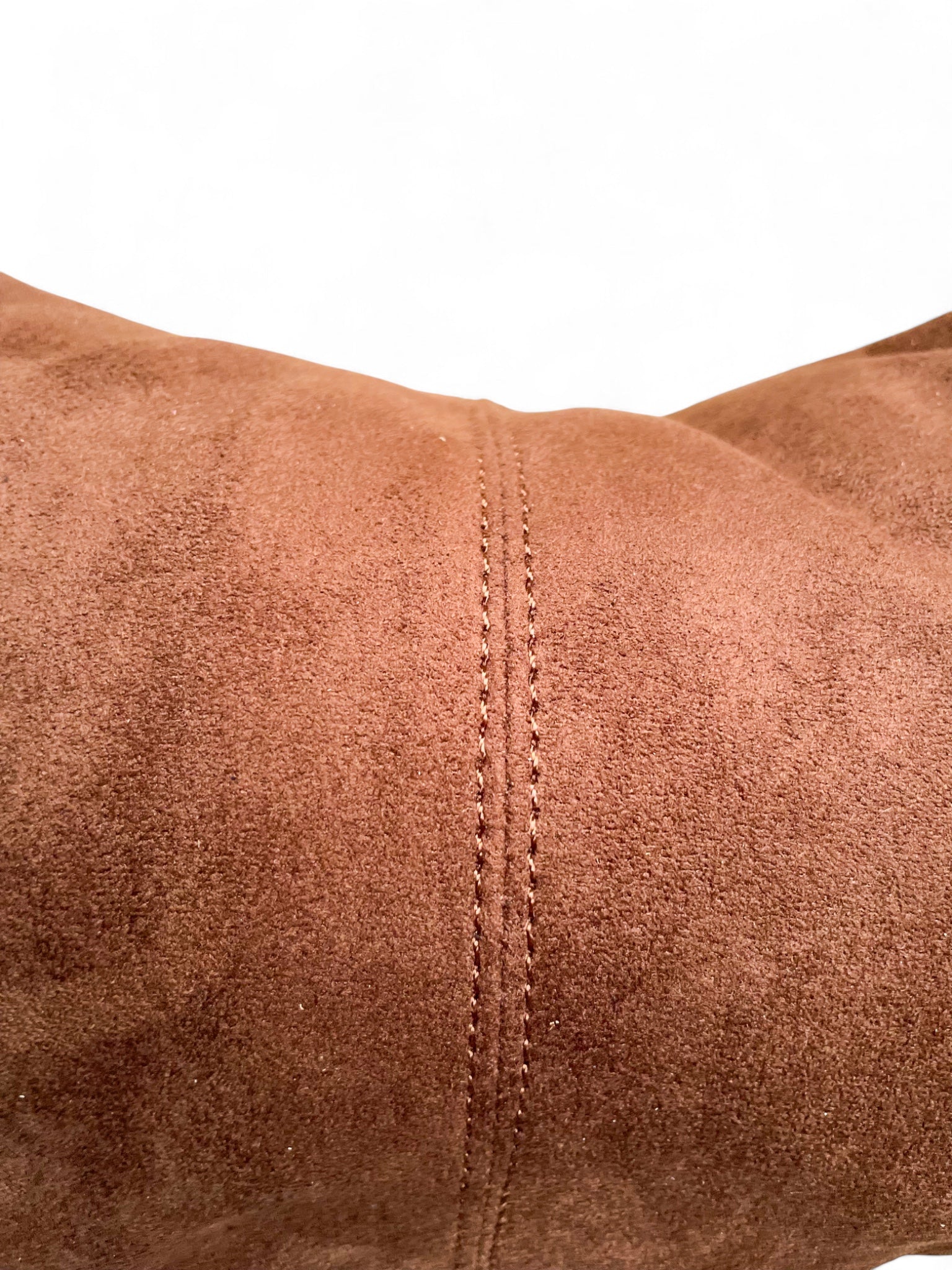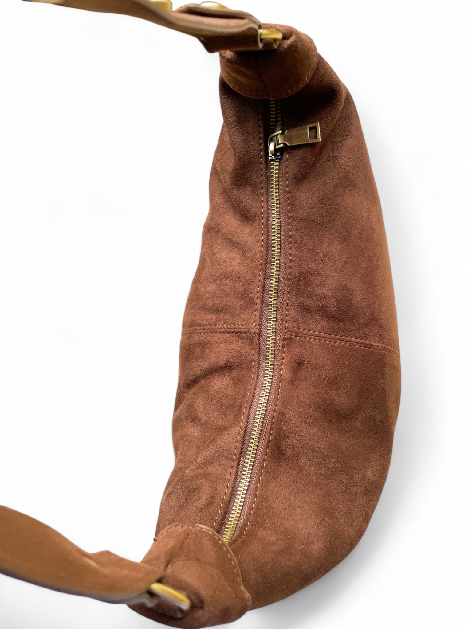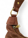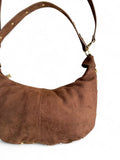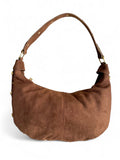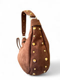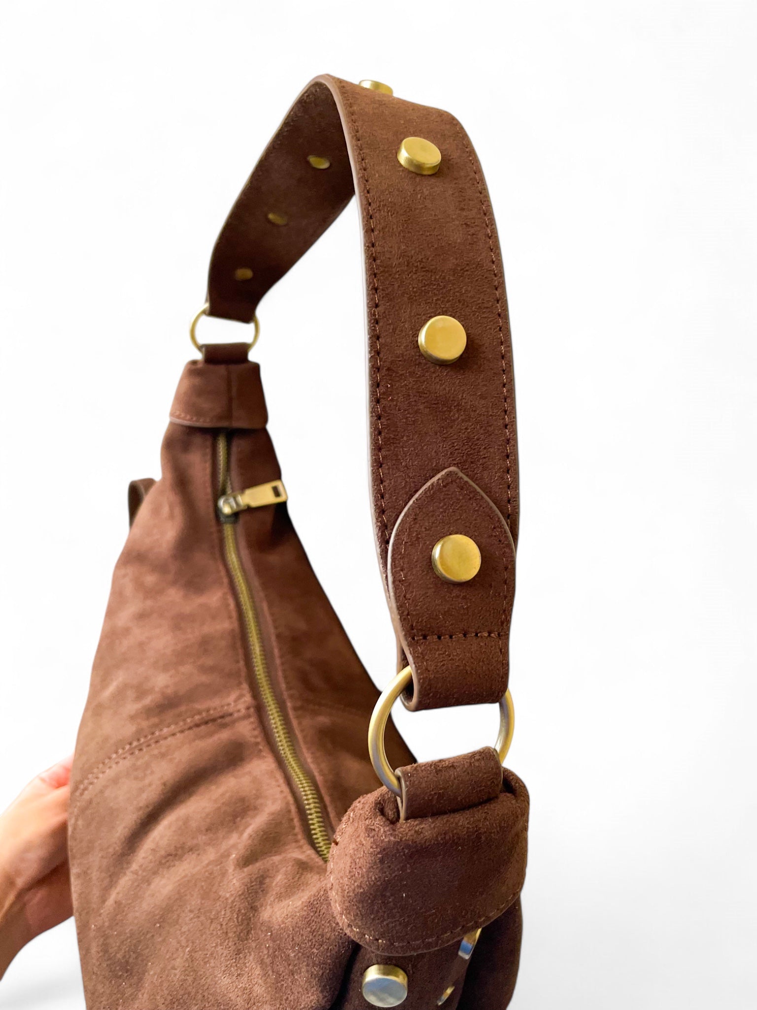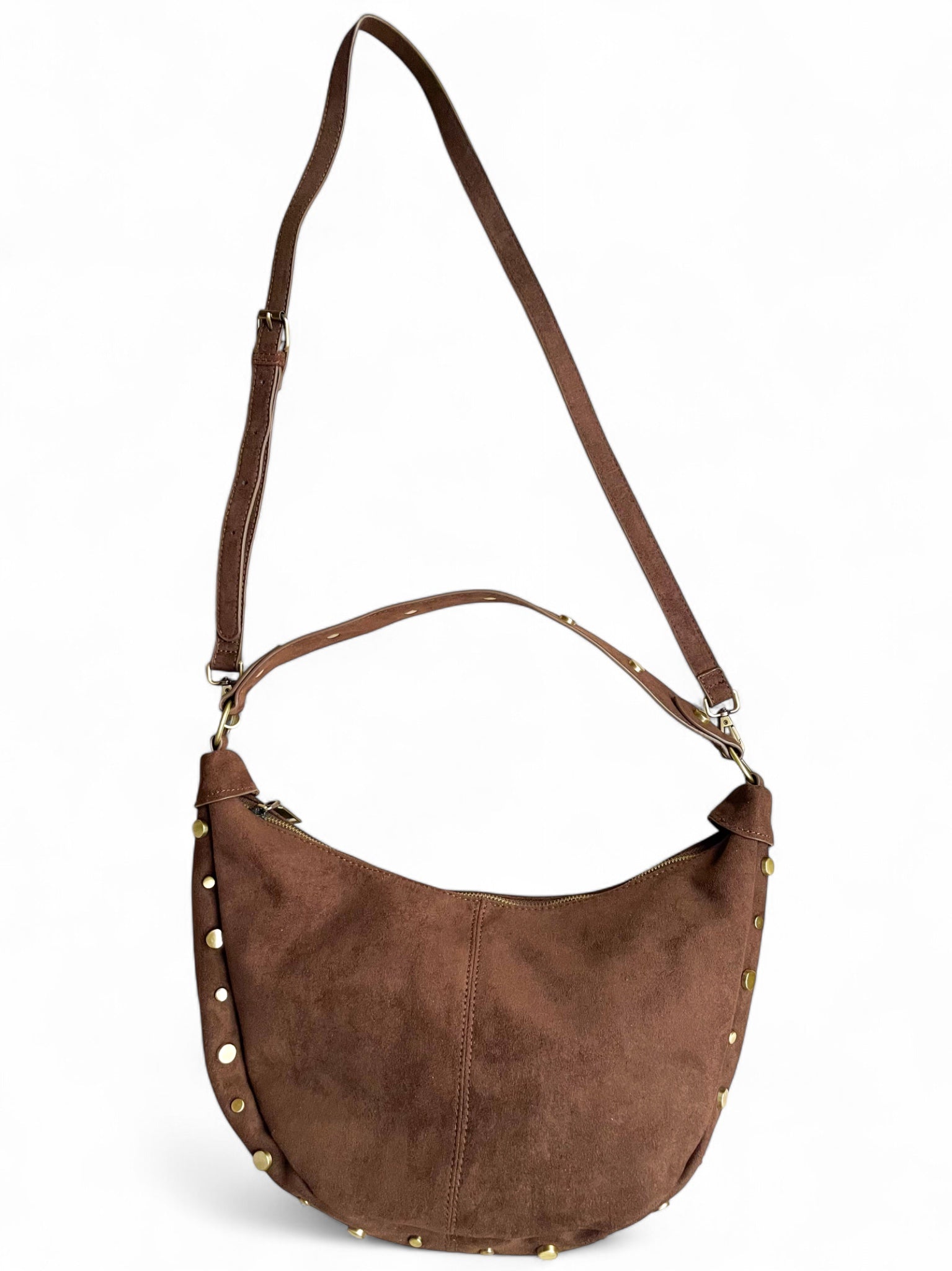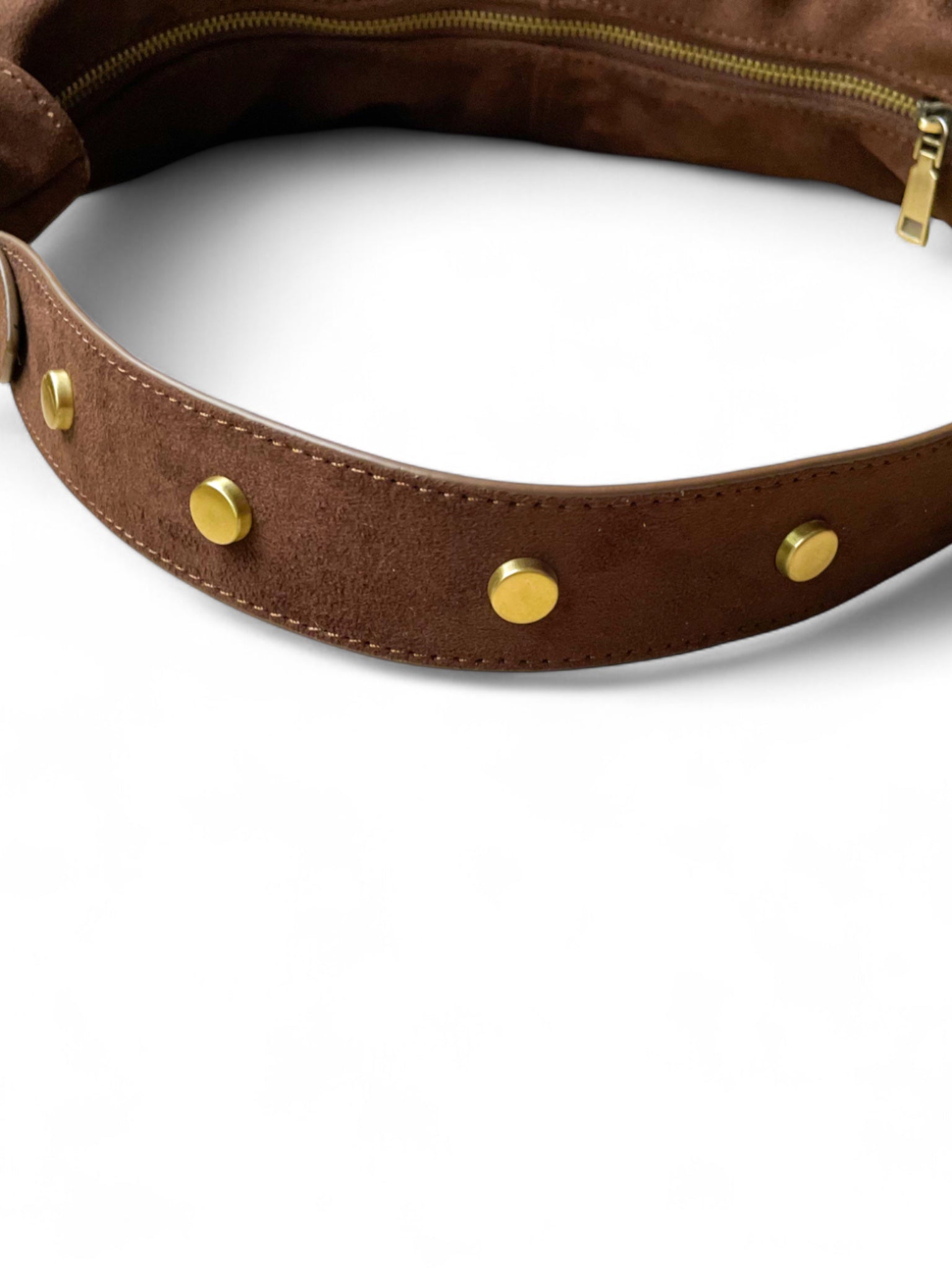 - Sac bandoulière Colette: un sac bandoulière en daim brun orné de rivets dorés sur les côtés et sur la petite bandoulière, au design arrondi et élégant pour un style bohème chic et intemporel.
