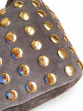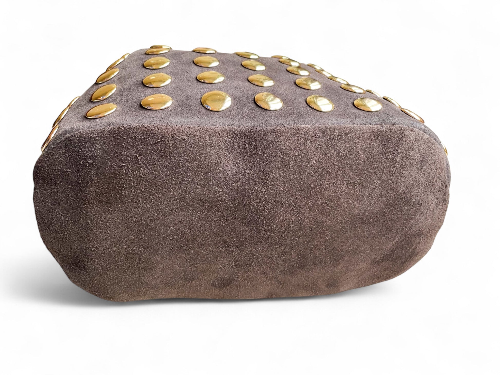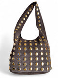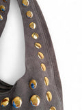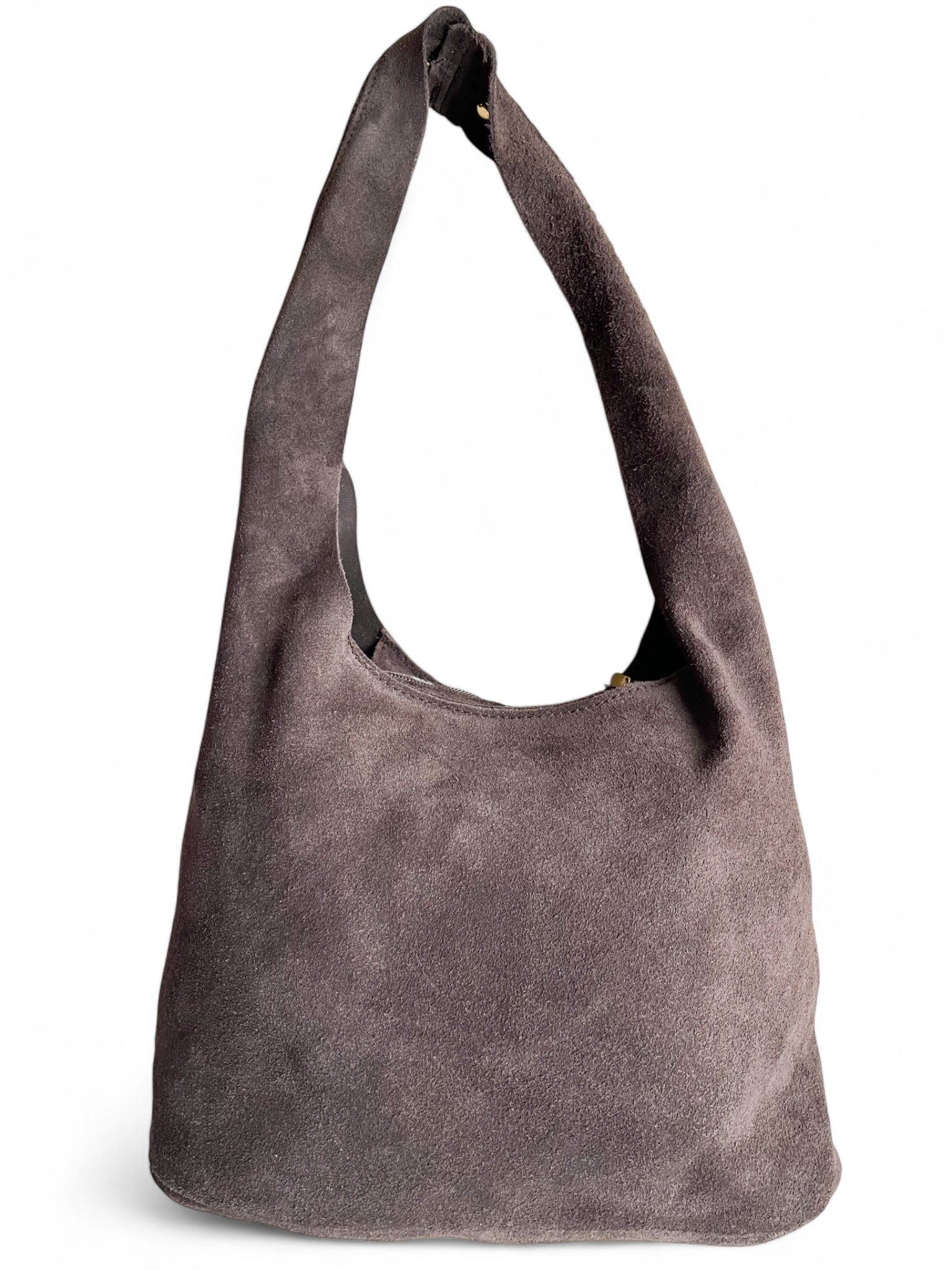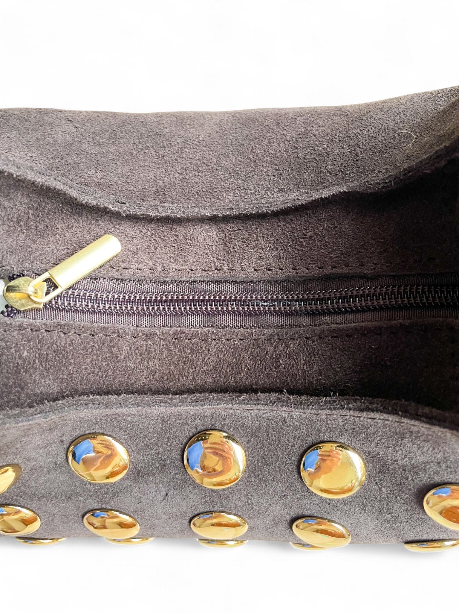 - Sac bandoulière Gaïa: un sac en daim orné de grands rivets dorés qui captent la lumière à chaque mouvement. Sa silhouette souple mais affirmée, sa anse intégrée et sa fermeture éclair en font une pièce à la fois audacieuse et élégante. Disponible en deux teintes intemporelles — camel et marron chocolat — il incarne l’esprit libre et chaleureux de l’automne.