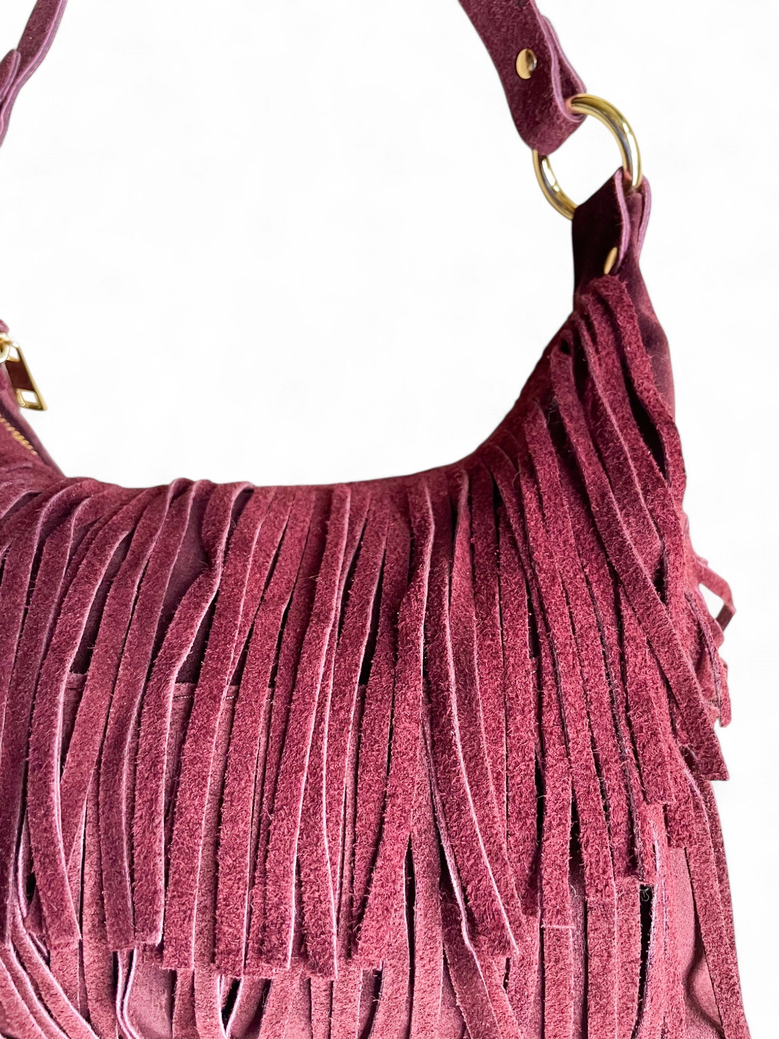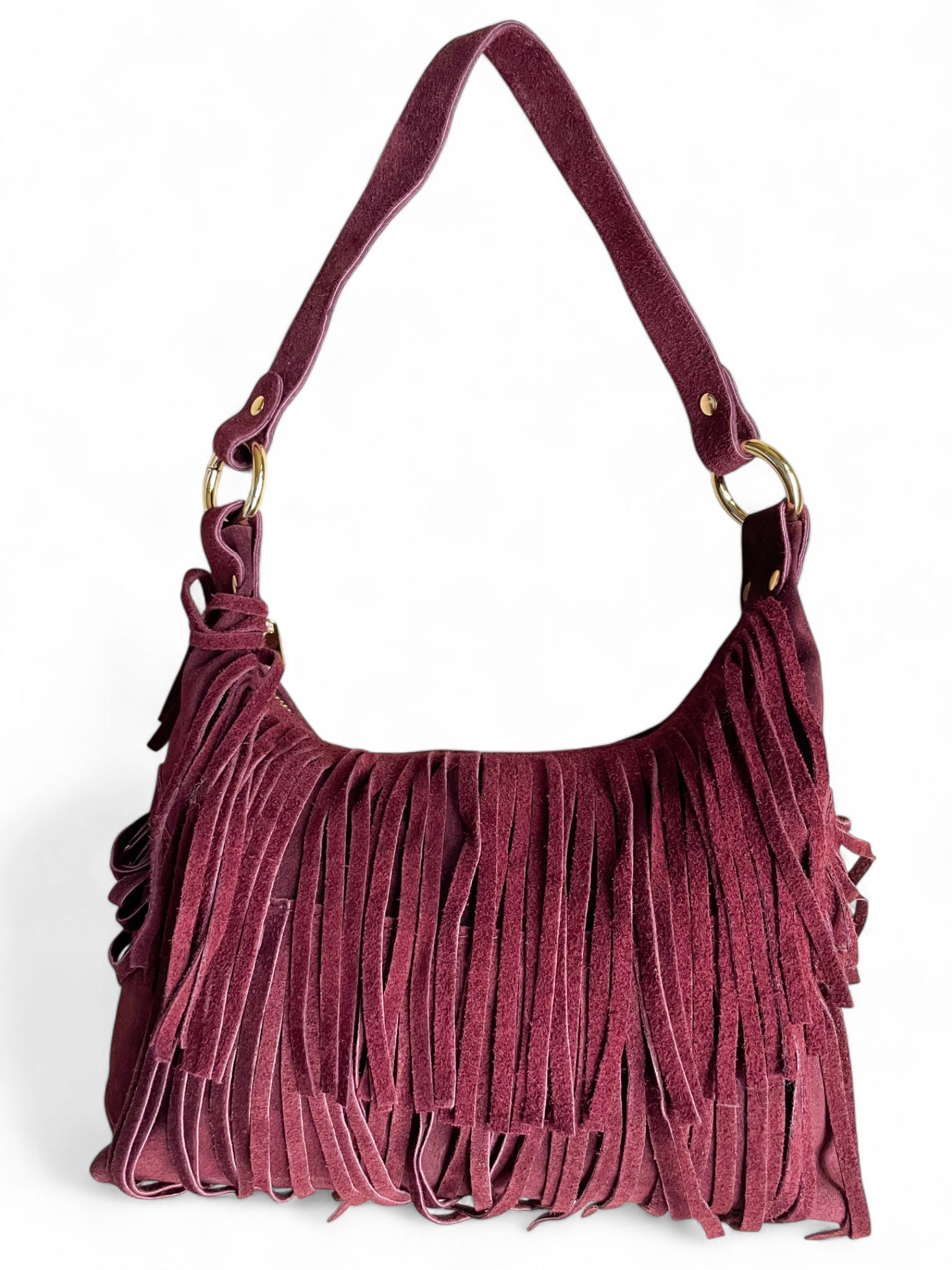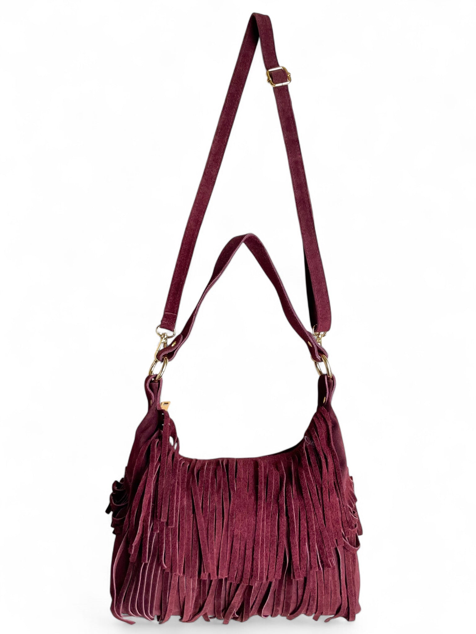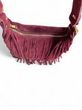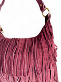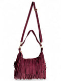 - Sac bandoulière Sienna: un sac bandoulière en daim orné de longues franges et d’anneaux dorés, disponible en deux teintes élégantes — bordeaux et noir —.