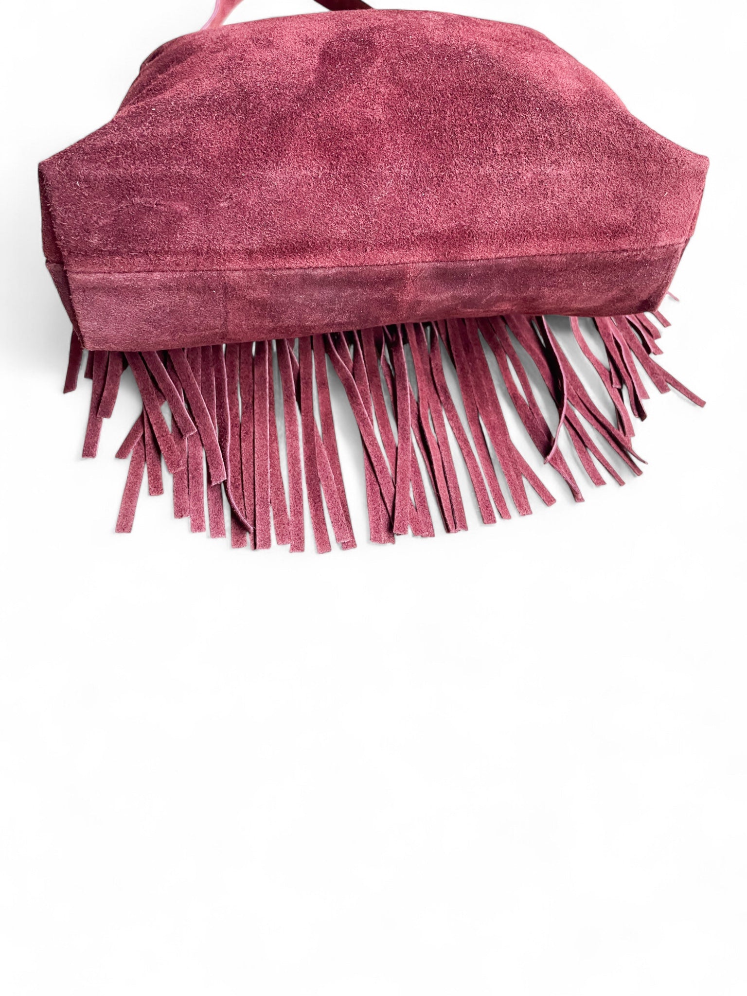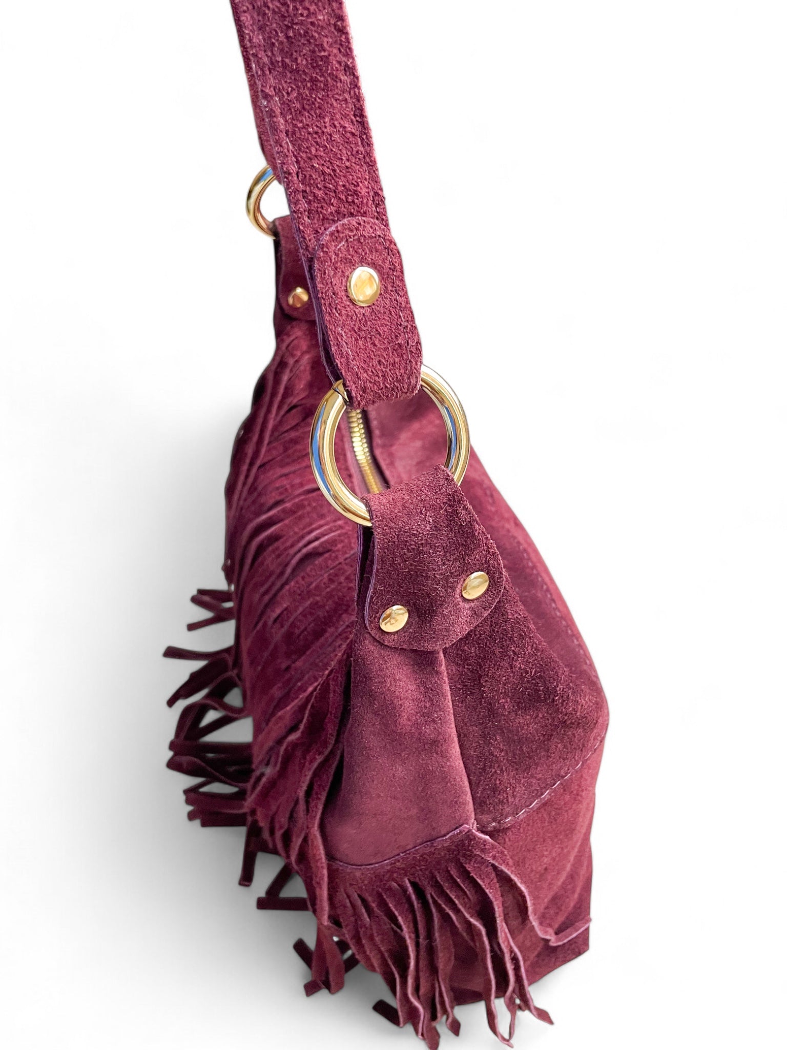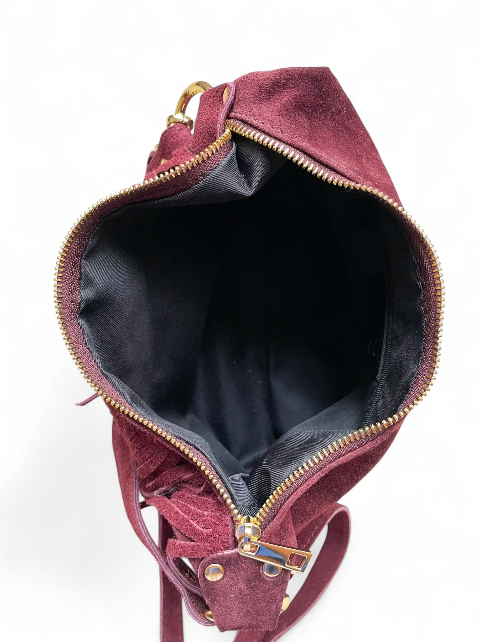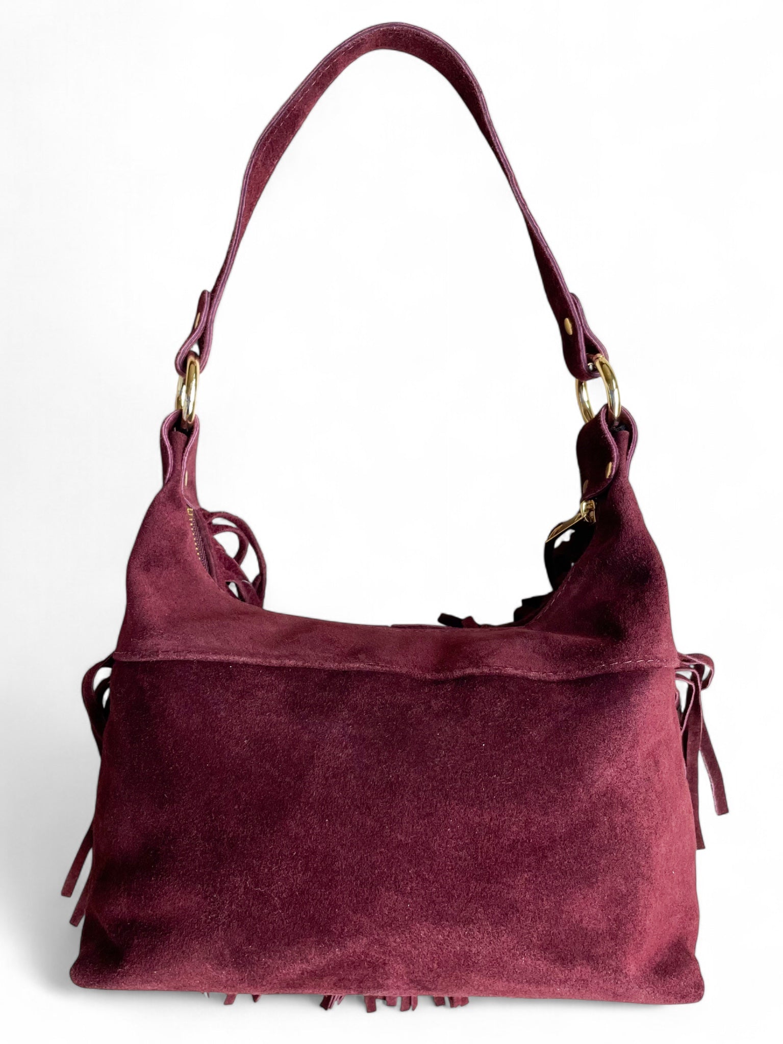 - Sac bandoulière Sienna: un sac bandoulière en daim orné de longues franges et d’anneaux dorés, disponible en deux teintes élégantes — bordeaux et noir —.