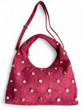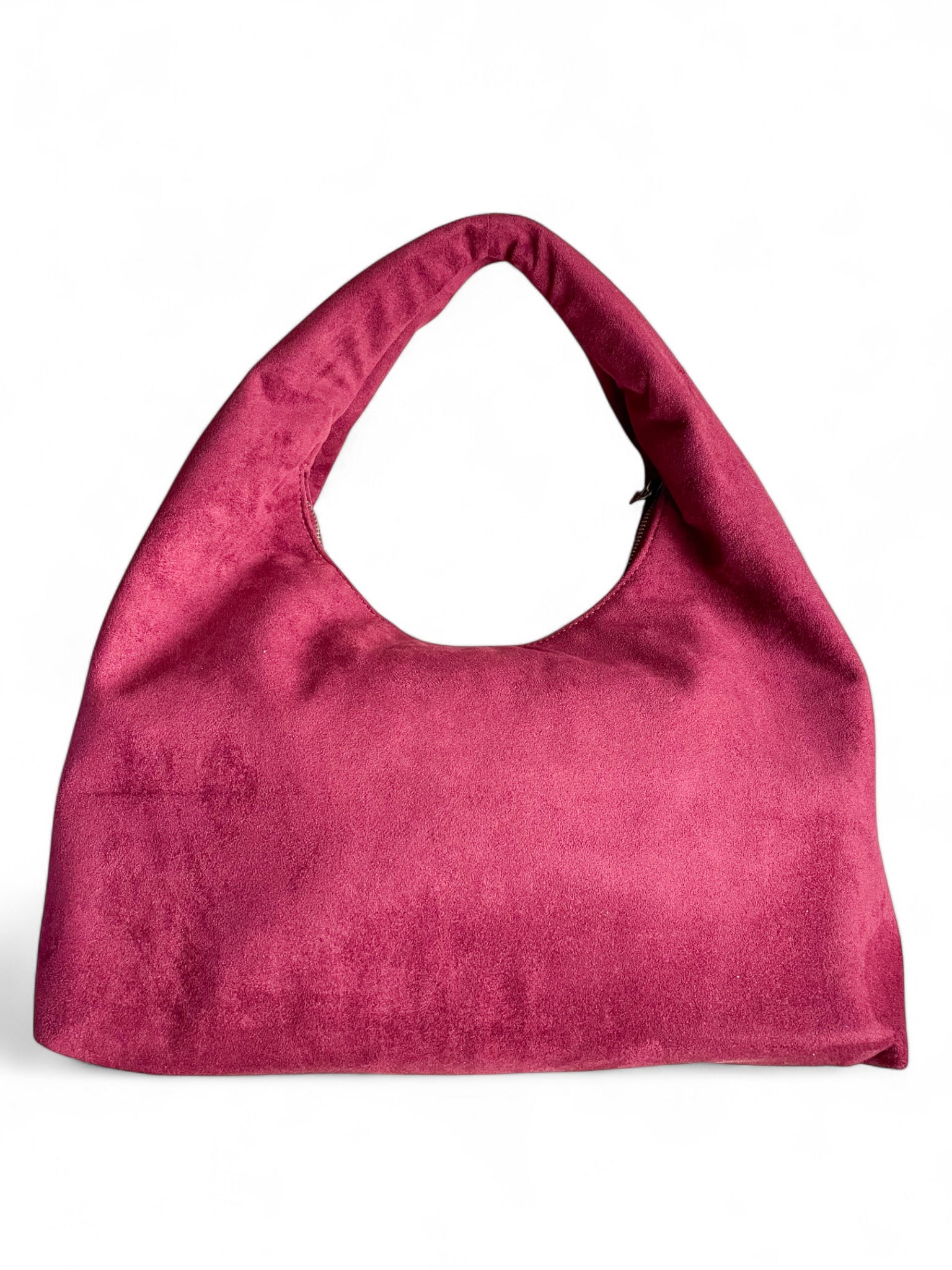 - Sac bandoulière Mila: un sac bandoulière en daim bordeaux orné de rivets dorés. Sa texture veloutée, sa forme souple et son anse intégrée lui donnent une allure à la fois naturelle et raffinée. Disponible en deux couleurs — bordeaux et marron chocolat—, et proposé en en deux tailles — grand ou petit —.