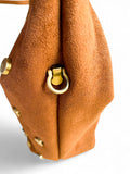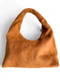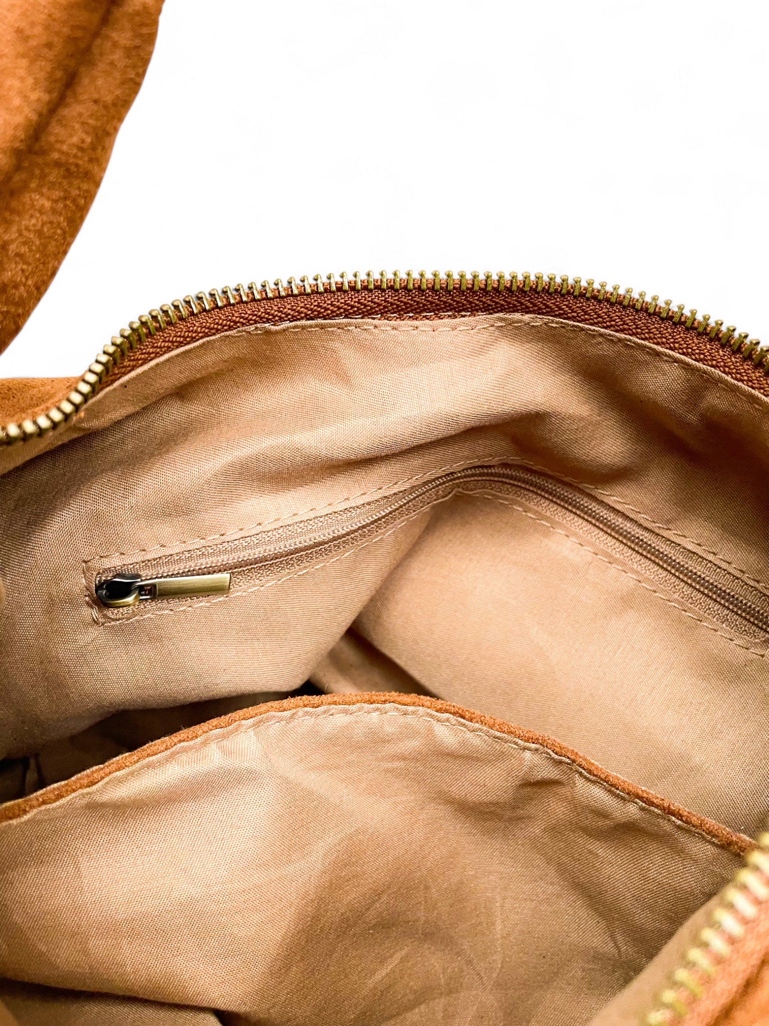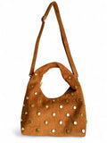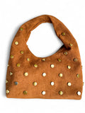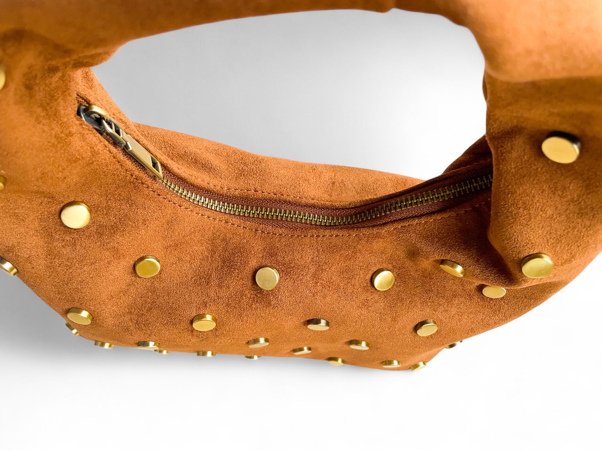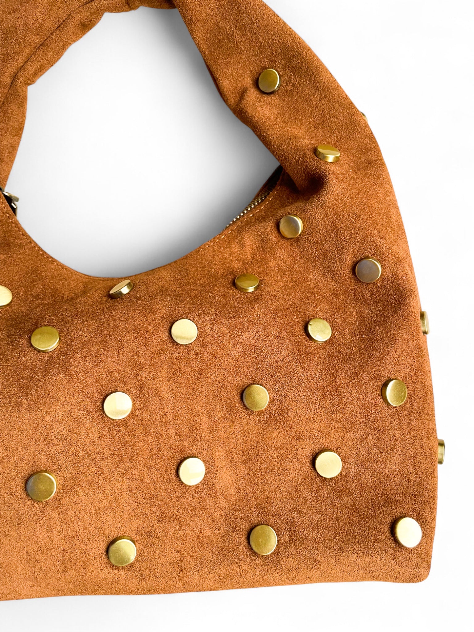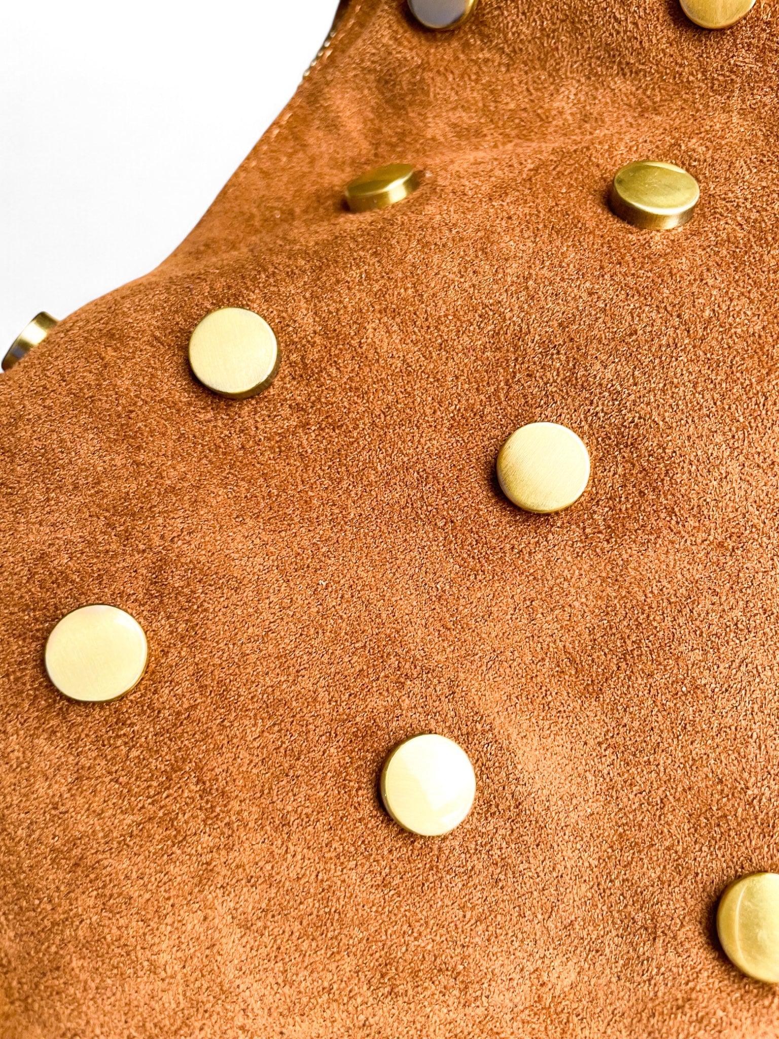 - Sac bandoulière Mila: un sac bandoulière en daim camel orné de rivets dorés. Sa texture veloutée, sa forme souple et son anse intégrée lui donnent une allure à la fois naturelle et raffinée. Disponible en deux couleurs — bordeaux et camel—, et proposé en en deux tailles — grand ou petit —.