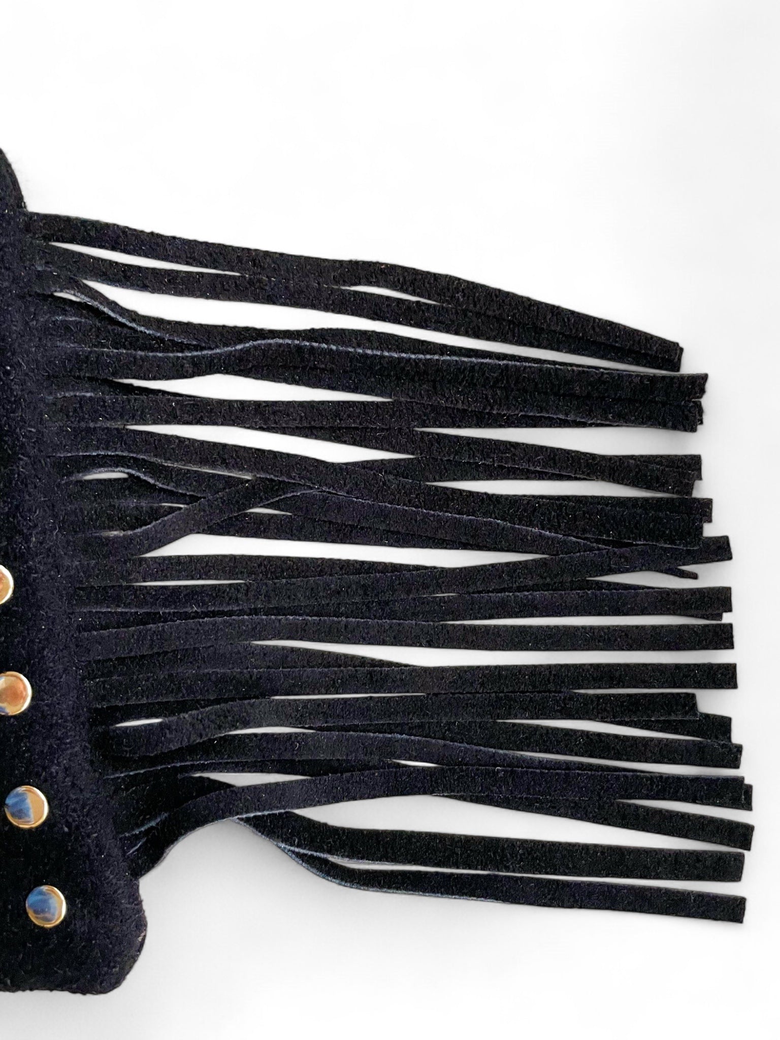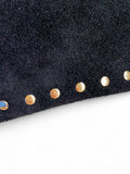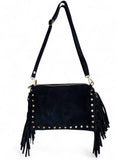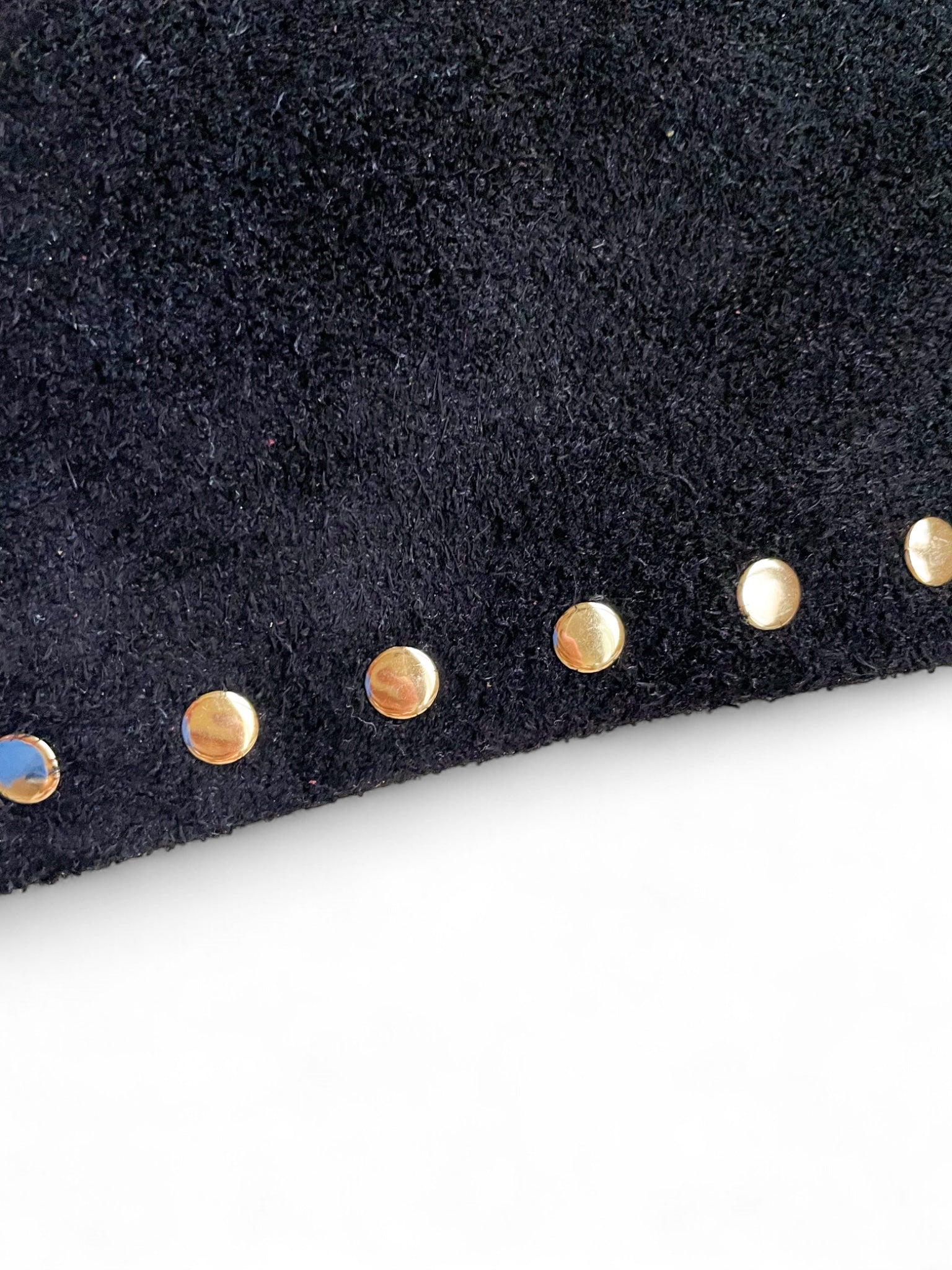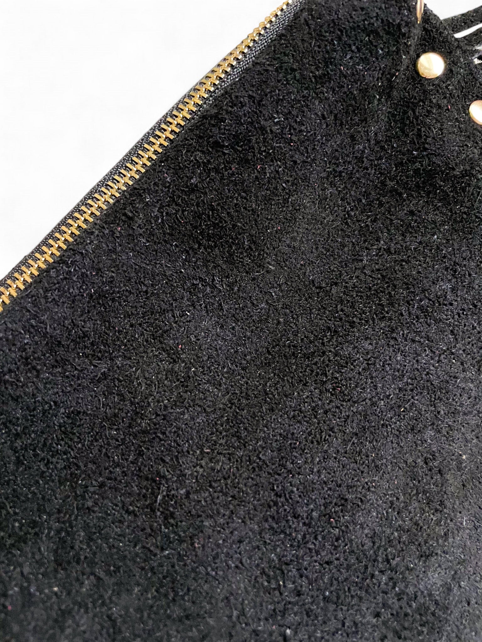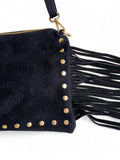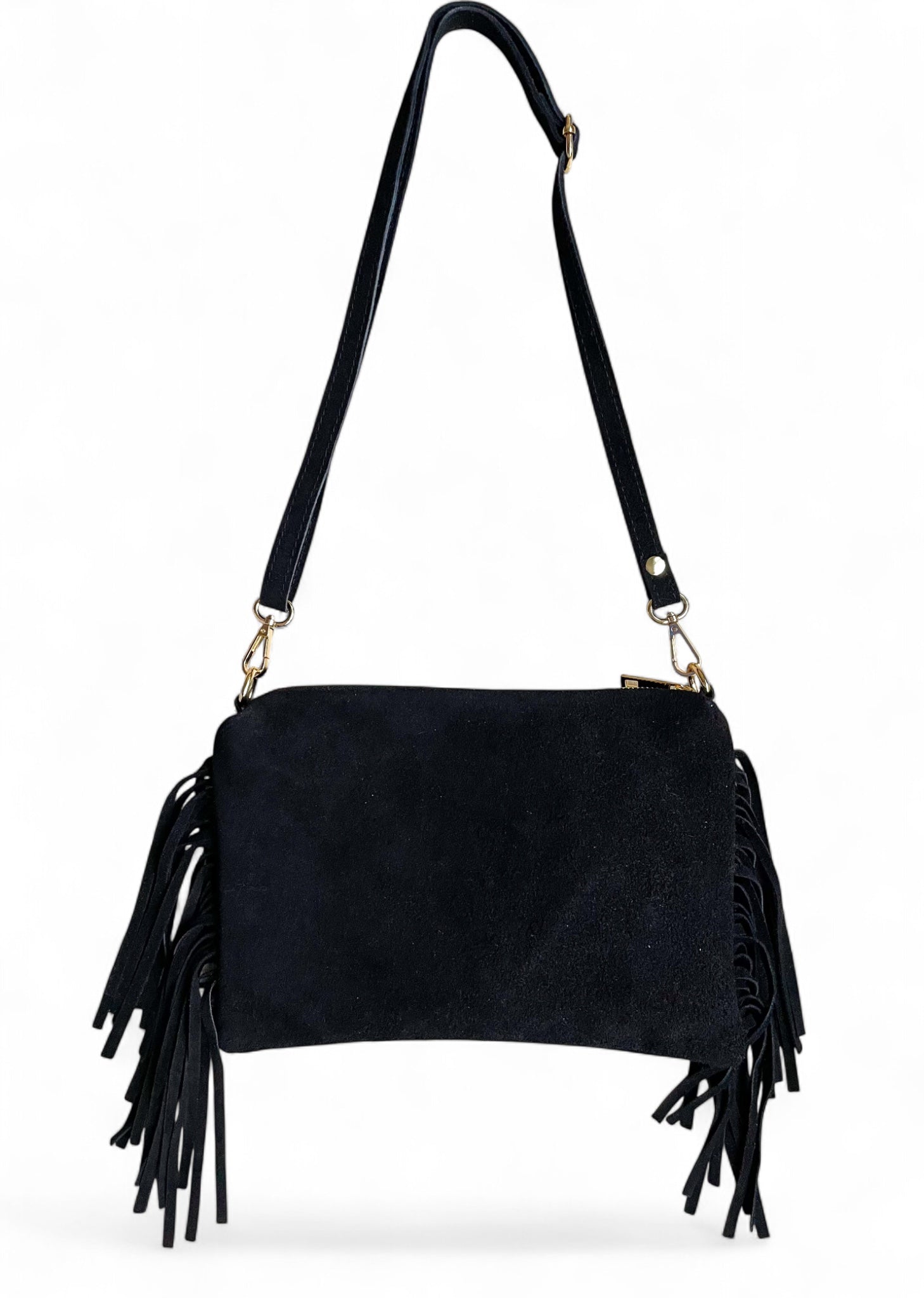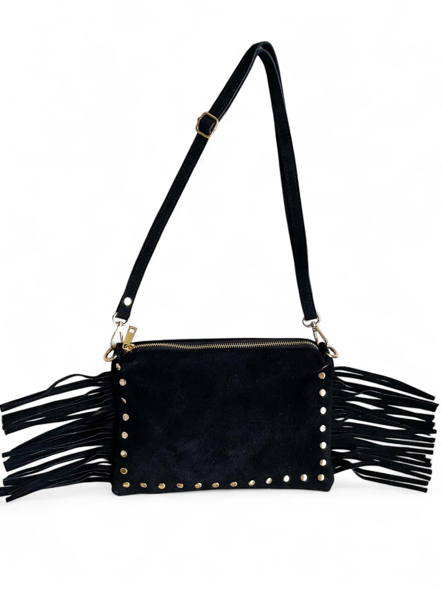 - Sac bandoulière Noa: un sac bandoulière en daim noir orné de franges latérales et de rivets dorés, qui allie caractère et élégance. Sa silhouette carrée et sa fermeture éclair en font un indispensable du style bohème moderne.