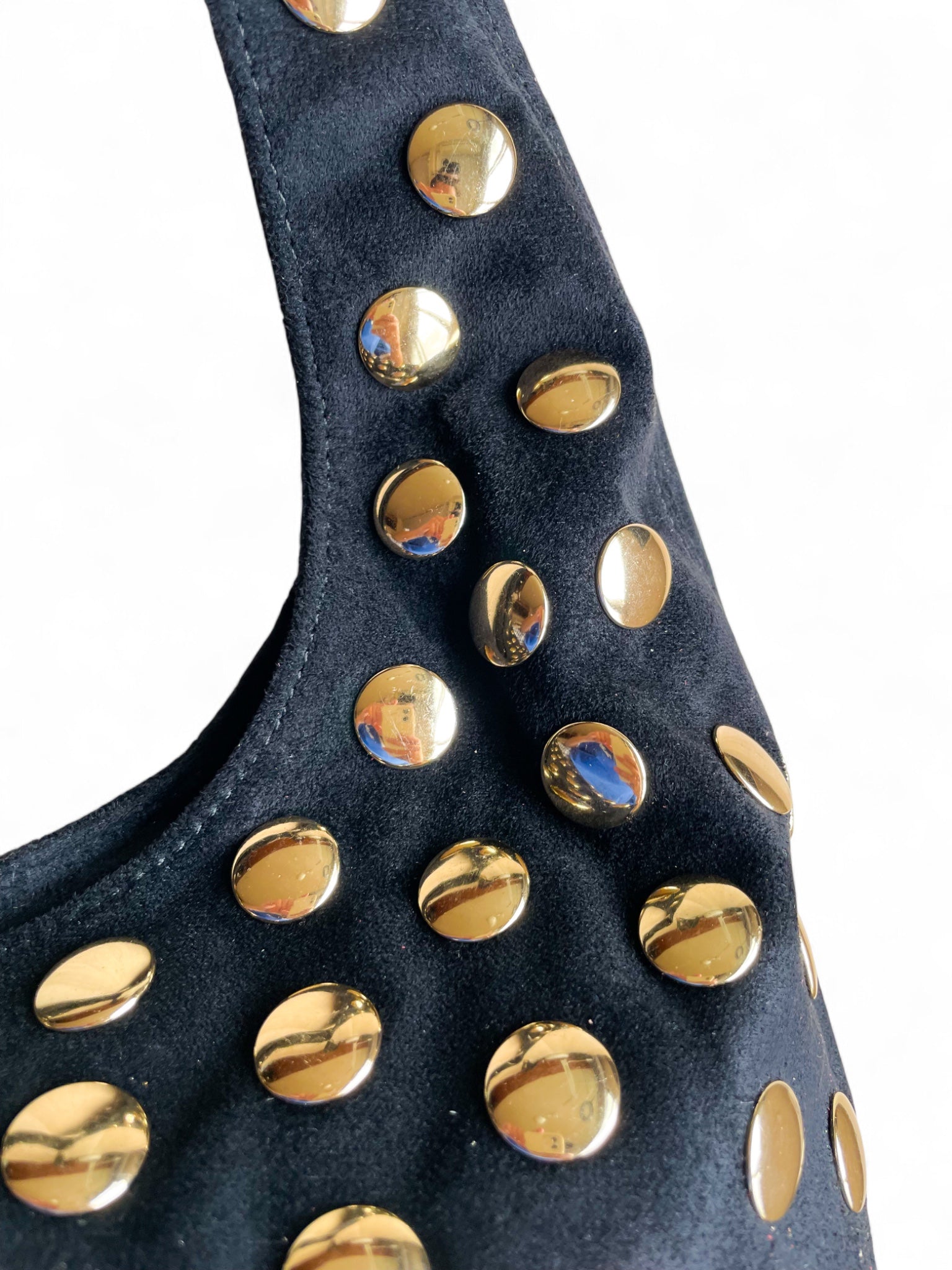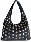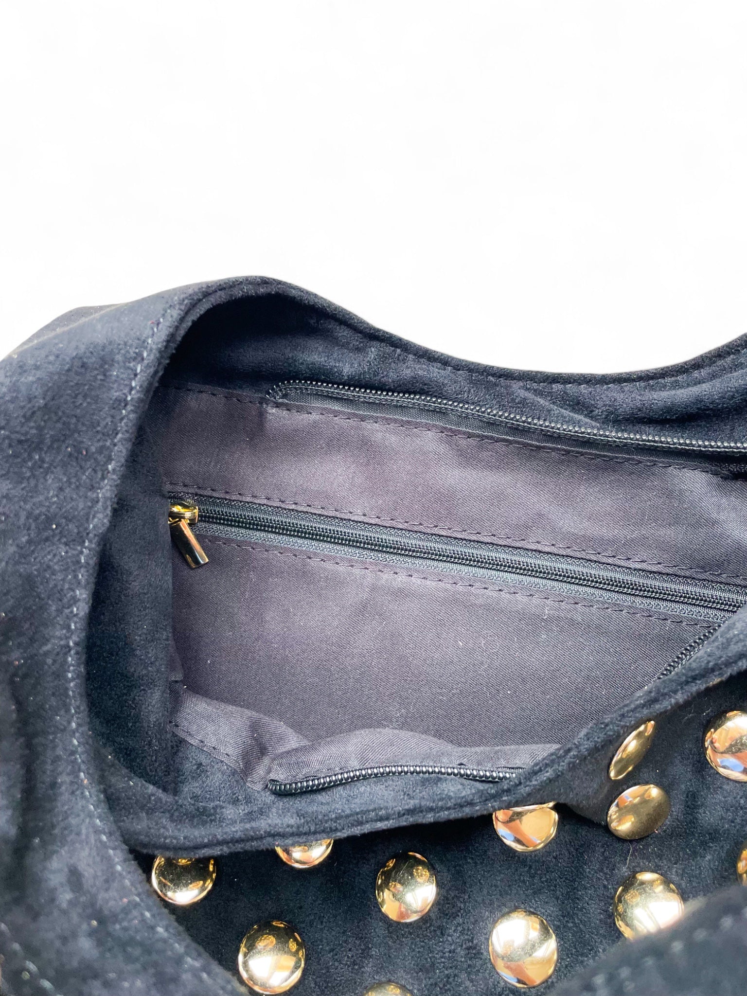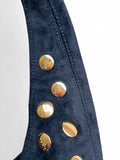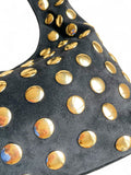 - Sac bandoulière Olia: un sac bandoulière kaki en daim orné de grands rivets dorés, au style bohème et affirmé. Sa anse fine et allongée, accompagnée d’une bandoulière longue ajustable, lui confère une allure plus moderne et fluide. Disponible aussi en noir!