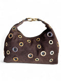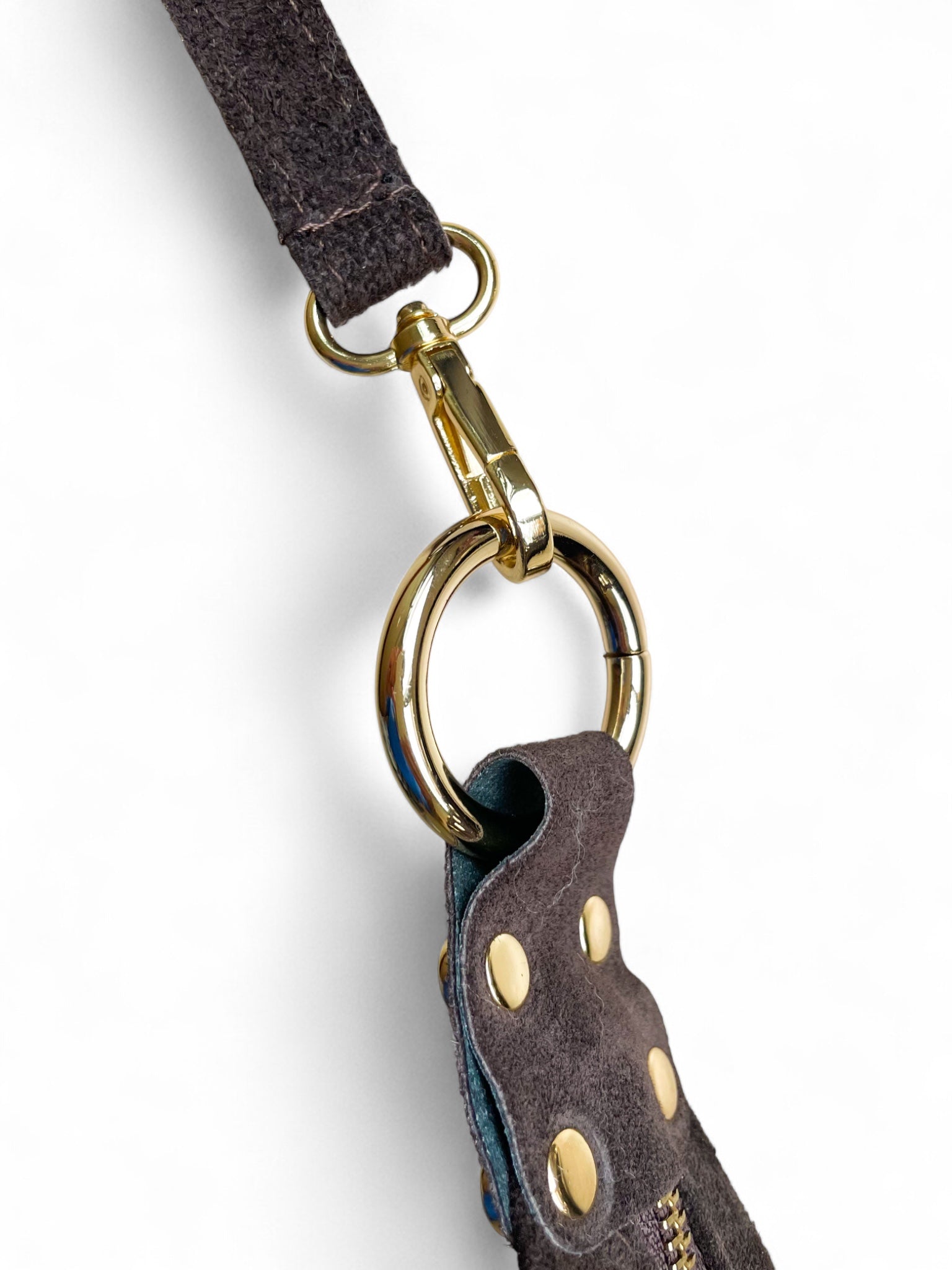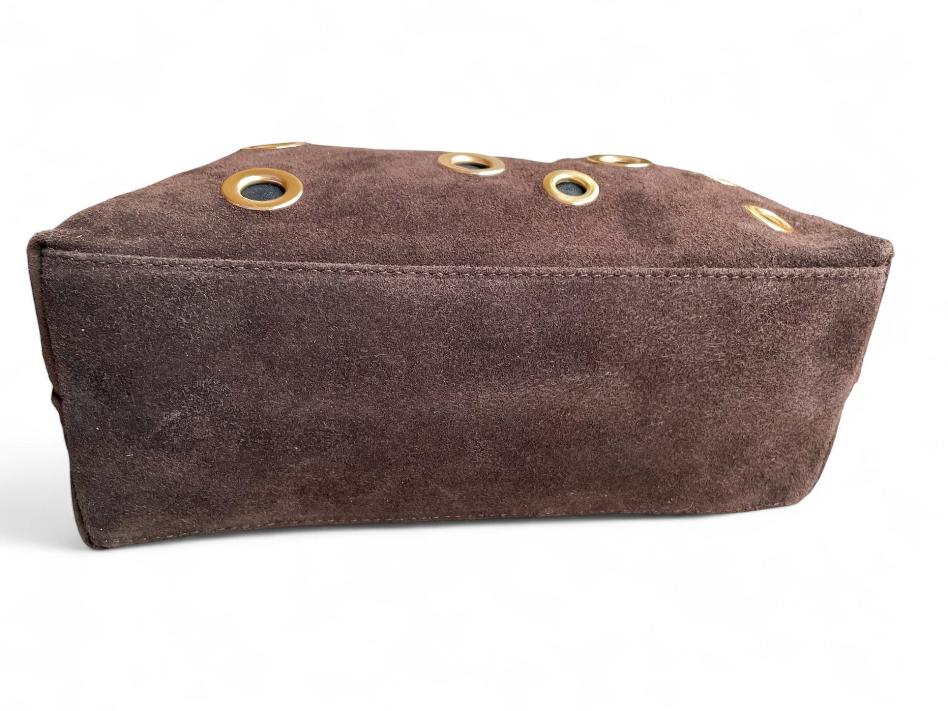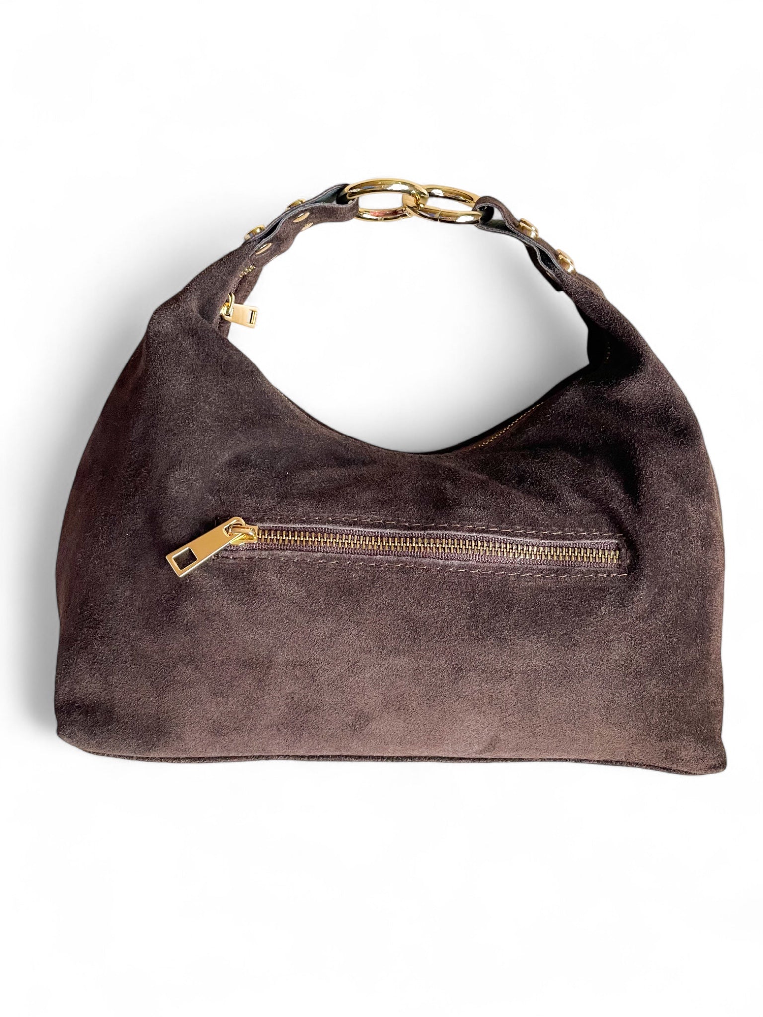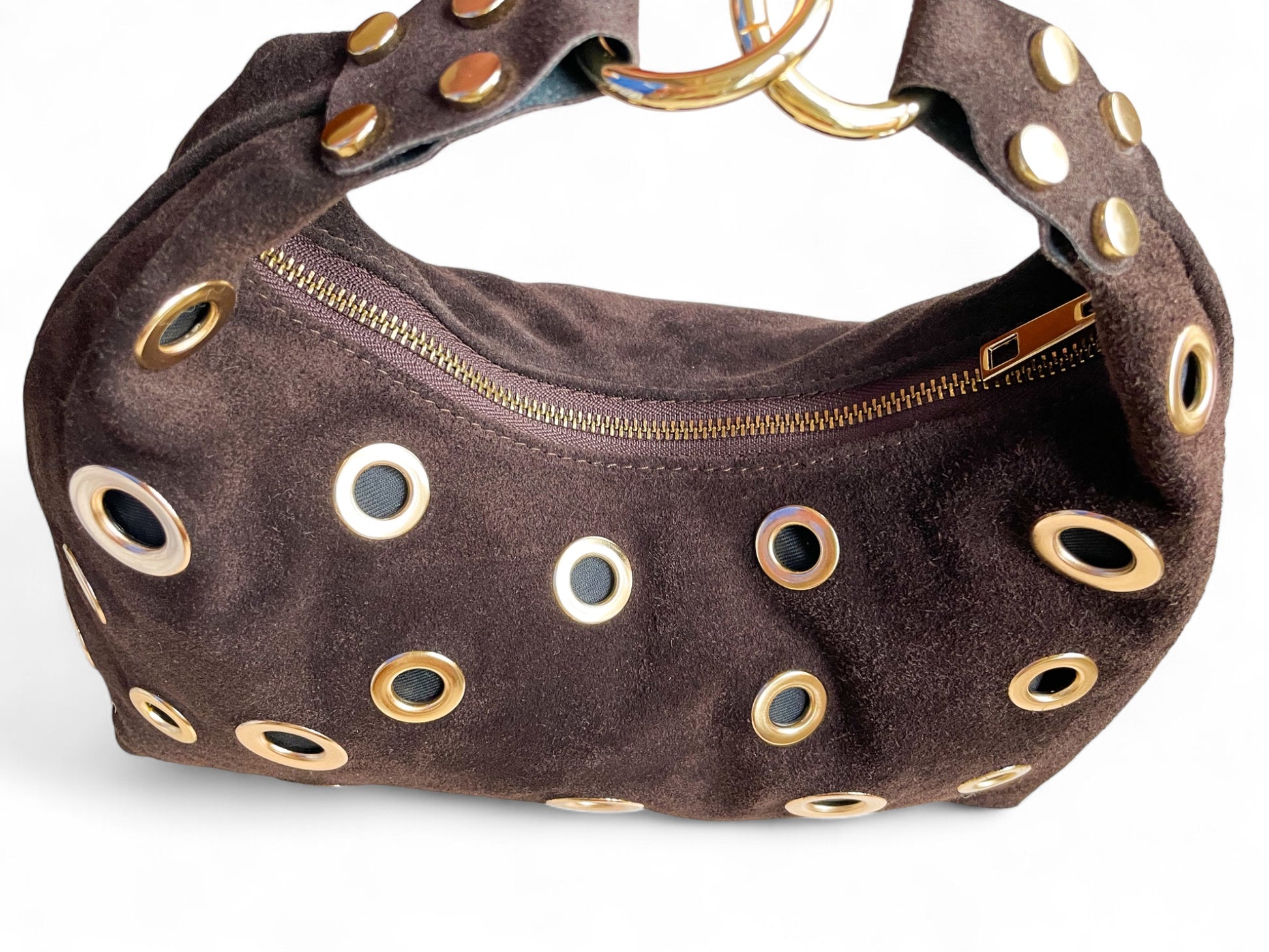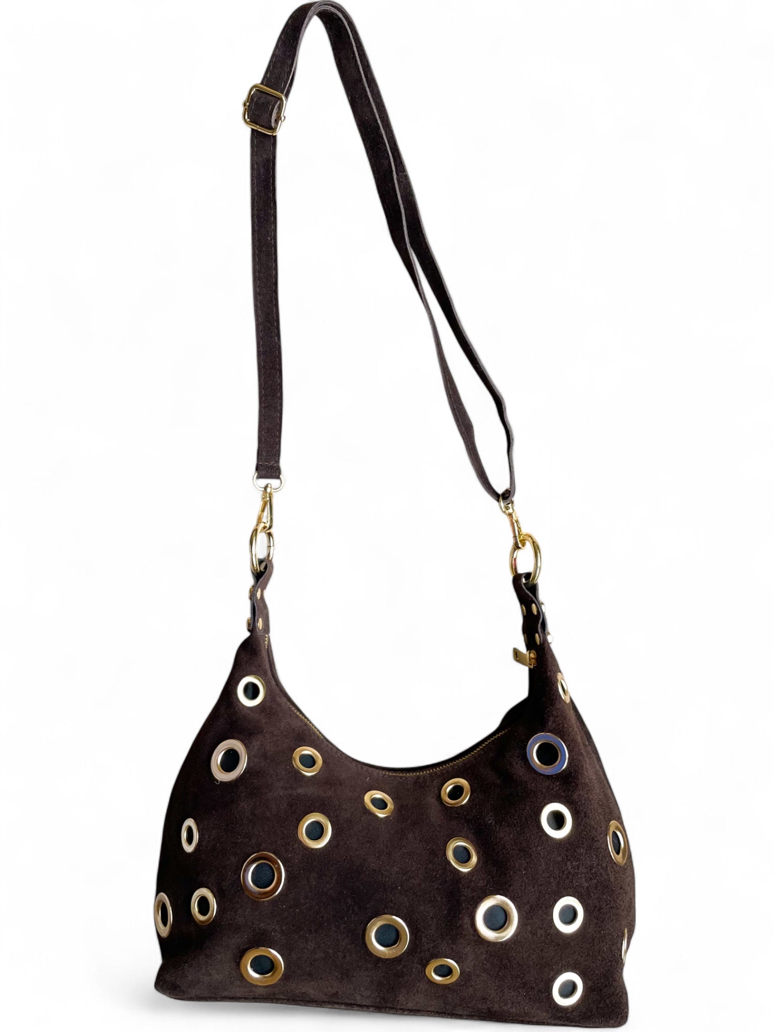 - Sac bandoulière Rebel: un sac en daim marron chocolat orné de grands œillets dorés, pensé pour celles qui aiment l’élégance avec une touche d’attitude. Proposé en cuir ou en daim.