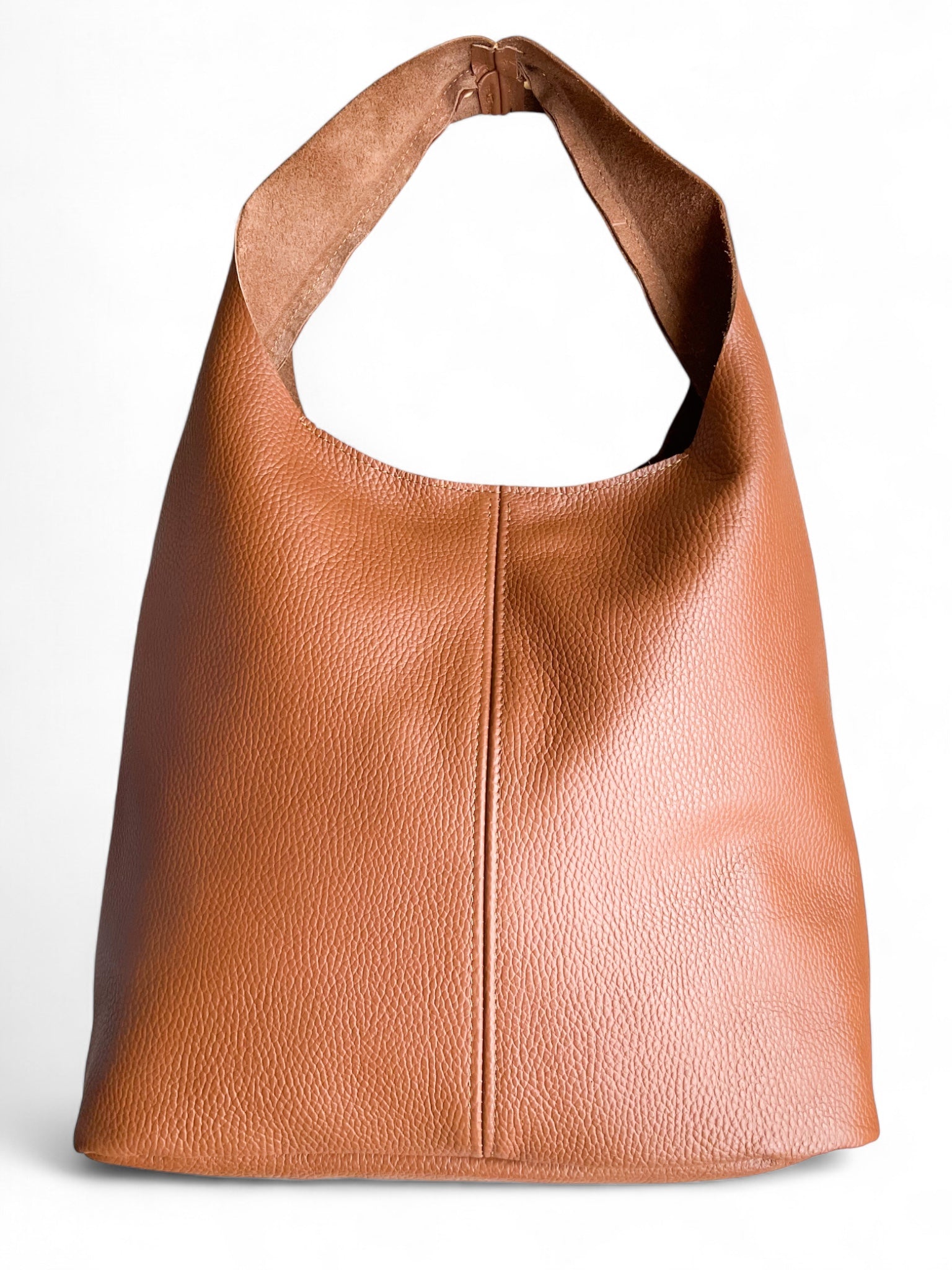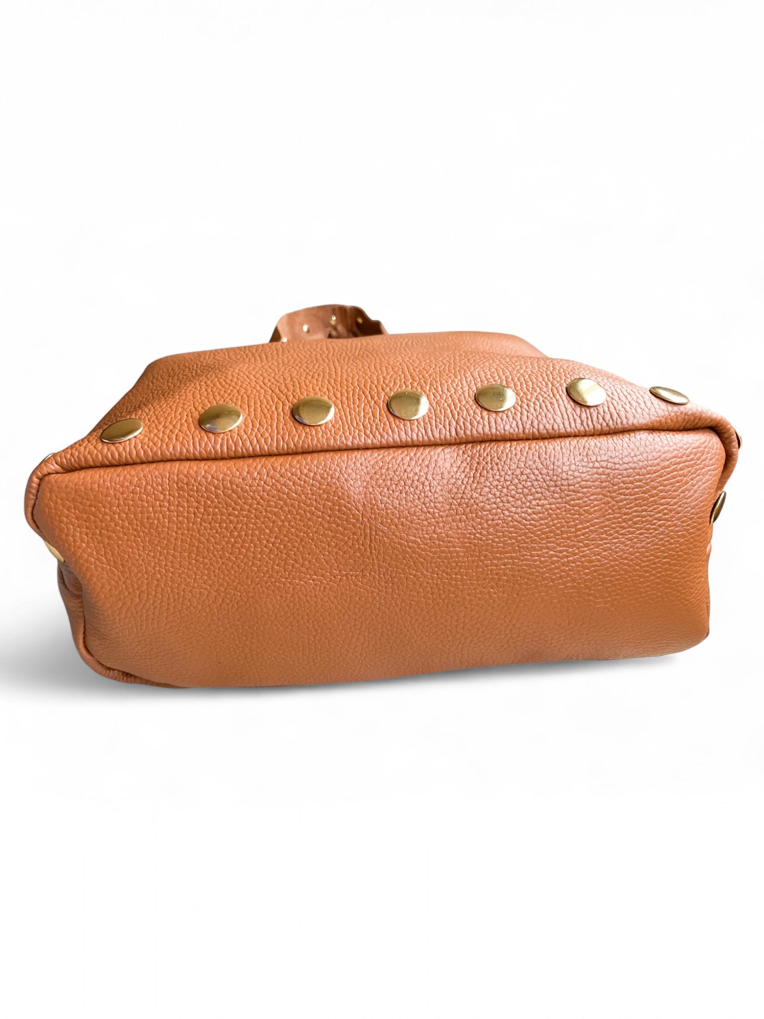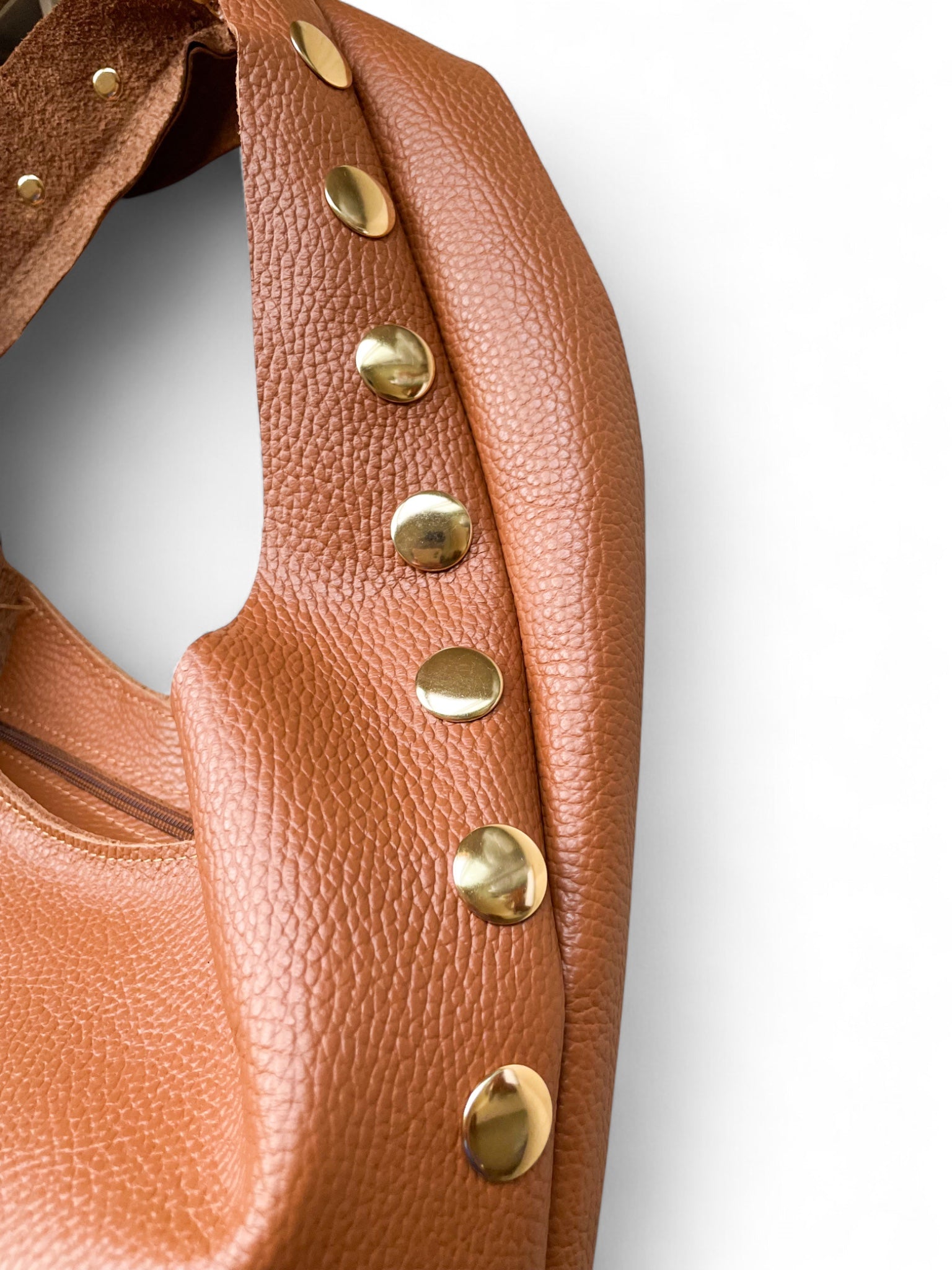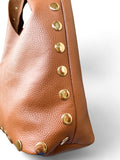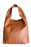 - Sac bandoulière Sienna: un sac bandoulière en cuir camel orné de larges rivets dorés. Sa silhouette souple et son toucher naturel en font la pièce idéale pour un look bohème chic et automnal.