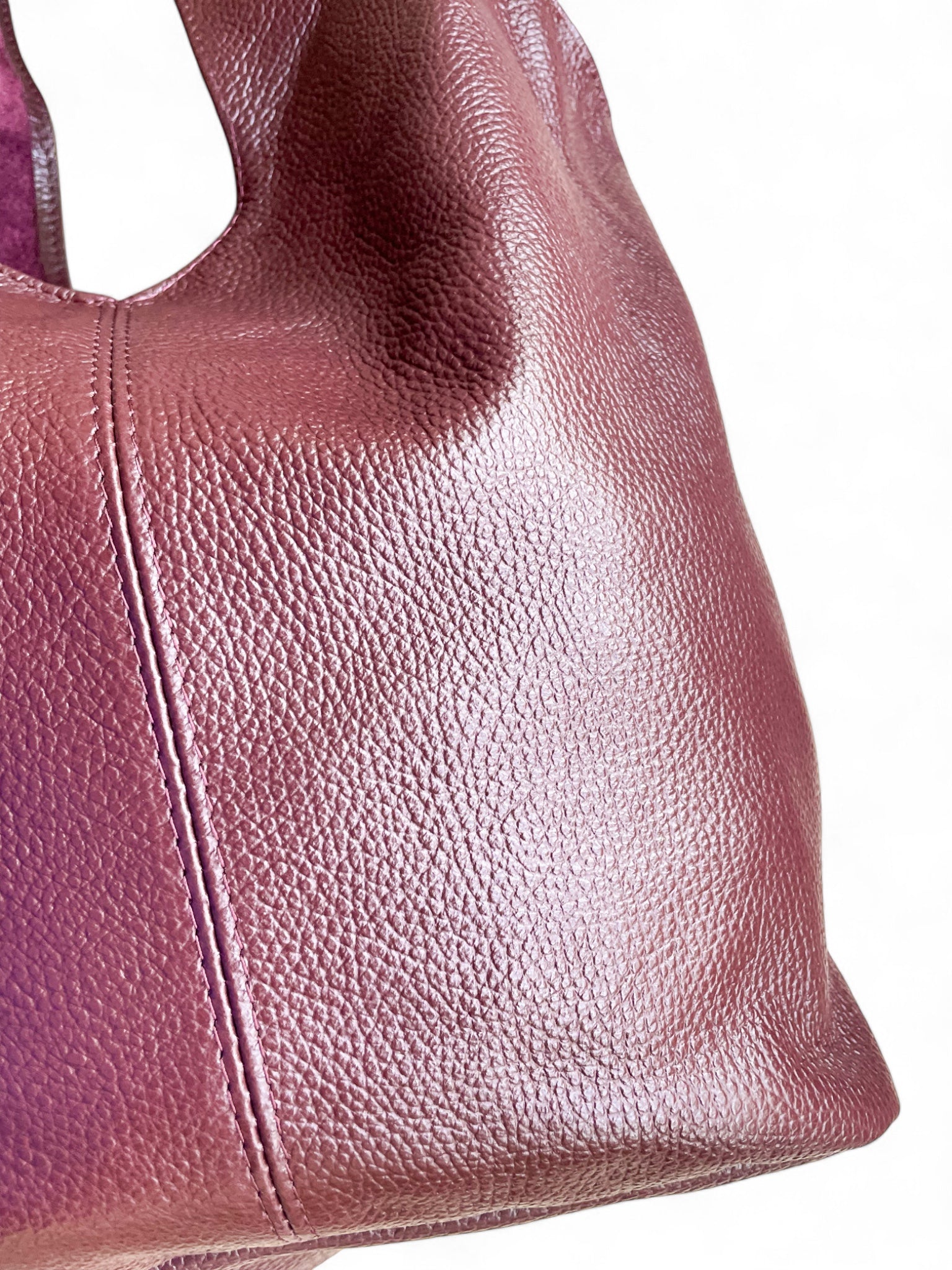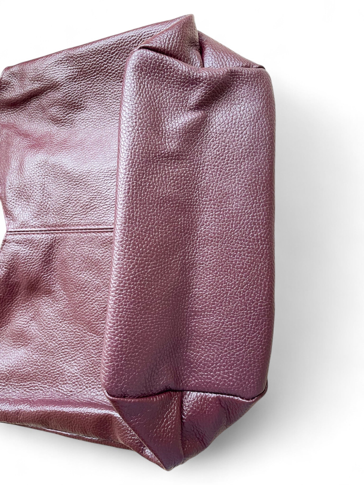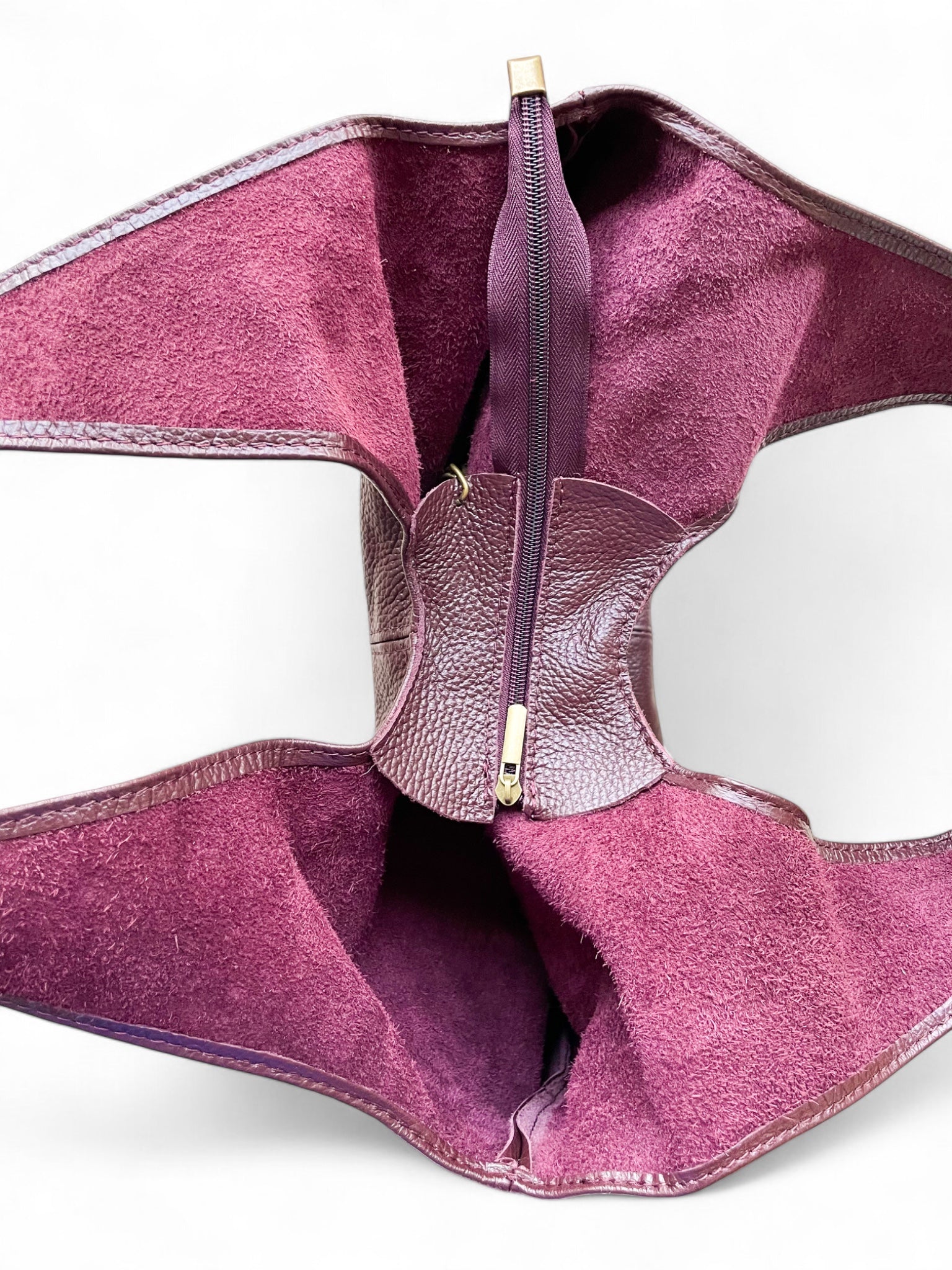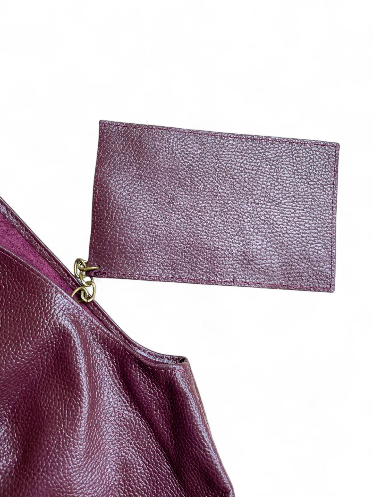 - Sac cabas Ruby: un sac cabas en cuir souple couleur bordeaux, à la silhouette épurée et au toucher texturé. Son design minimaliste s’accompagne d’une fermeture éclair discrète et d’une petite pochette intérieure assortie, idéale pour retrouver facilement vos clés, cartes ou petits essentiels. Léger et spacieux, Ruby s’inspire du charme naturel de la saison automnale.
